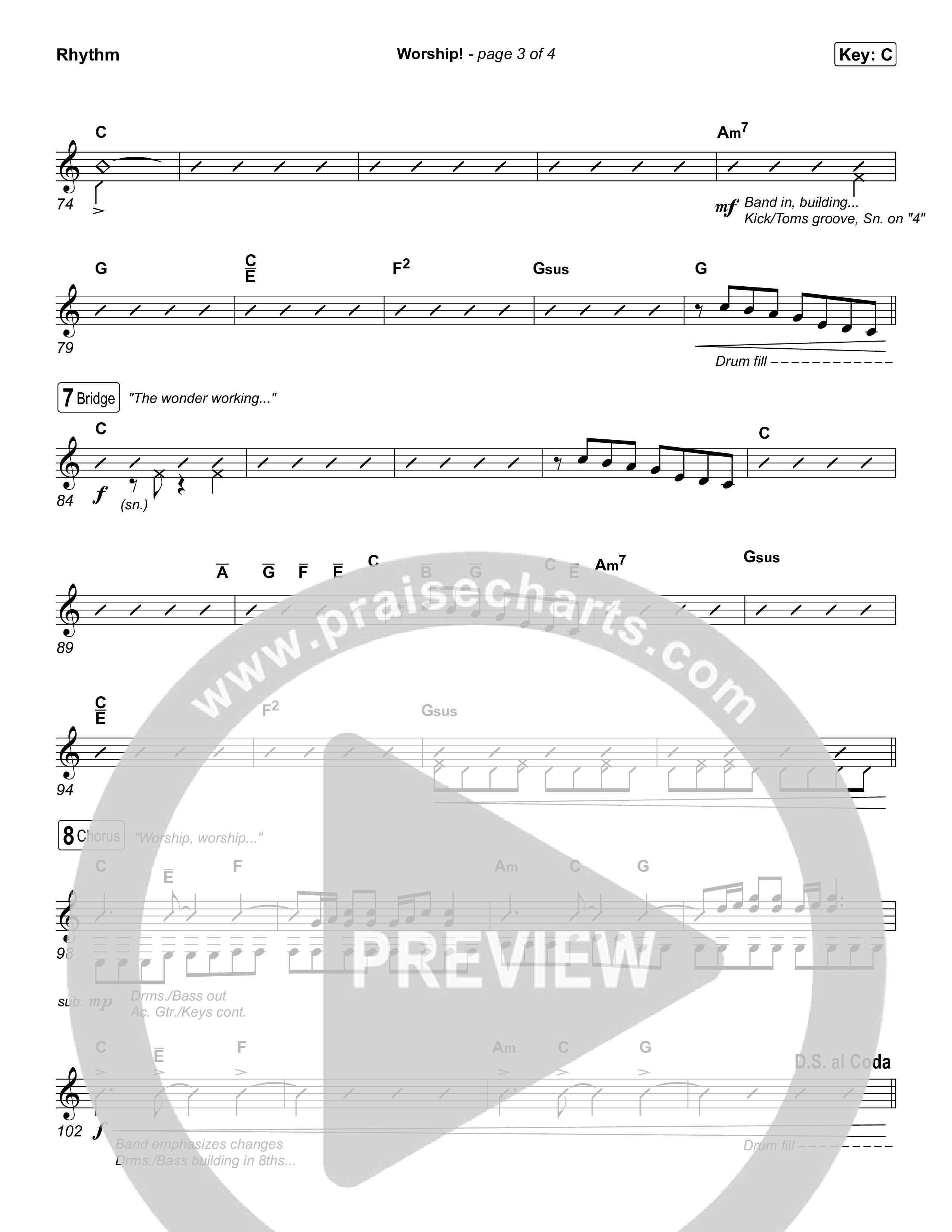 Download the Rhythm Chart for Worship! by TAYA, from the album The Reminder. This song was arranged by Grant Wall / Daniel Galbraith in the key of Bb, C.