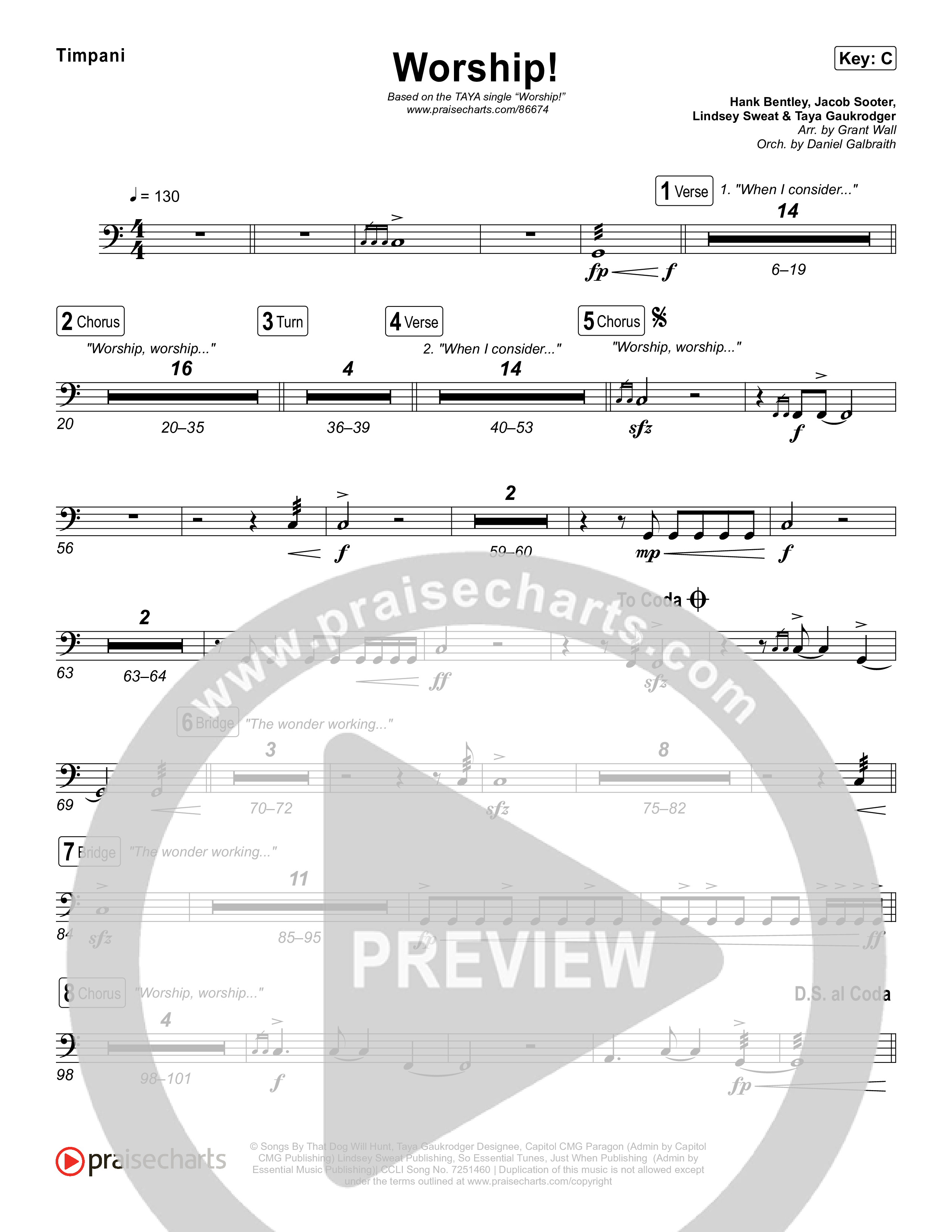 Download the Timpani sheet music for Worship! by TAYA, from the album The Reminder. This song was arranged by Grant Wall / Daniel Galbraith in the key of Bb, C.