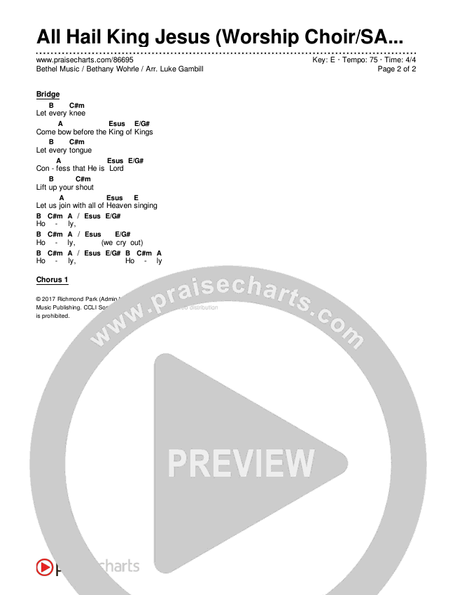 Download the PDF Chord Charts for All Hail King Jesus (Worship Choir/SAB) by Bethel Music / Bethany Wohrle / Arr. Luke Gambill, from the album Homecoming. This song was arranged by Luke Gambill / Daniel Galbraith / Erik Foster in the key of E.