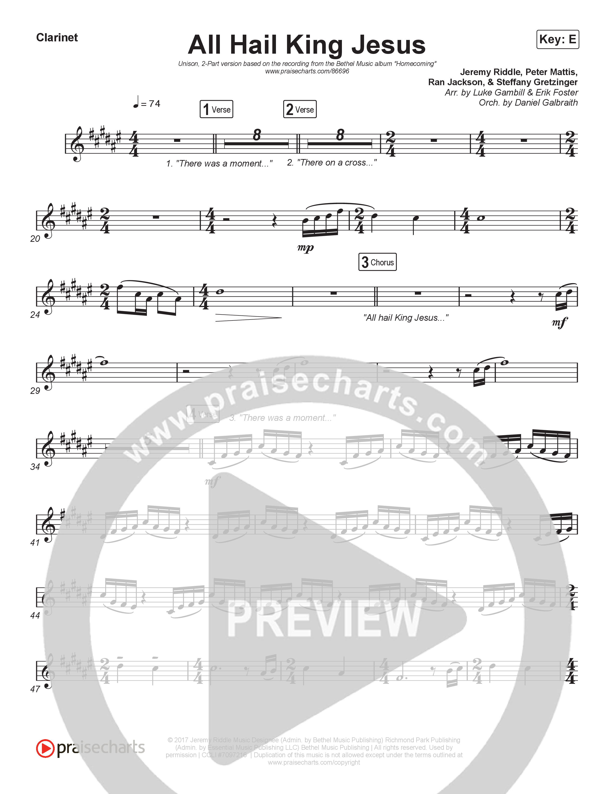 Download the Orchestration for All Hail King Jesus (Unison/2-Part) by Bethel Music / Bethany Wohrle / Arr. Luke Gambill, from the album Homecoming. This song was arranged by Luke Gambill / Daniel Galbraith / Erik Foster in the key of E.