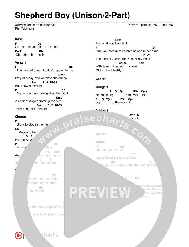 Download the PDF Chord Charts for Shepherd Boy (Unison/2-Part) by Phil Wickham / Arr. Luke Gambill, from the album Hallelujah! It's Christmas!. This song was arranged by Luke Gambill / Daniel Galbraith / Grant Wall in the key of F.