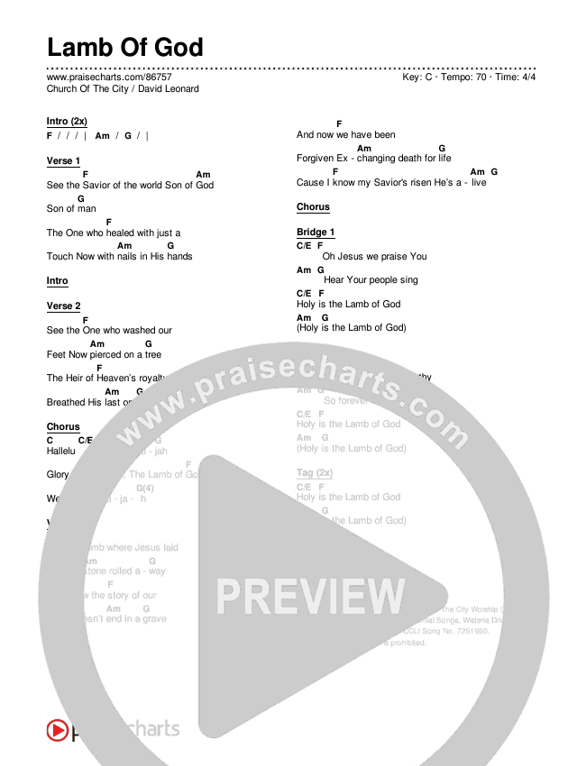 Download the PDF Chord Charts for Lamb Of God by Church Of The City / David Leonard, from the album Lamb Of God.