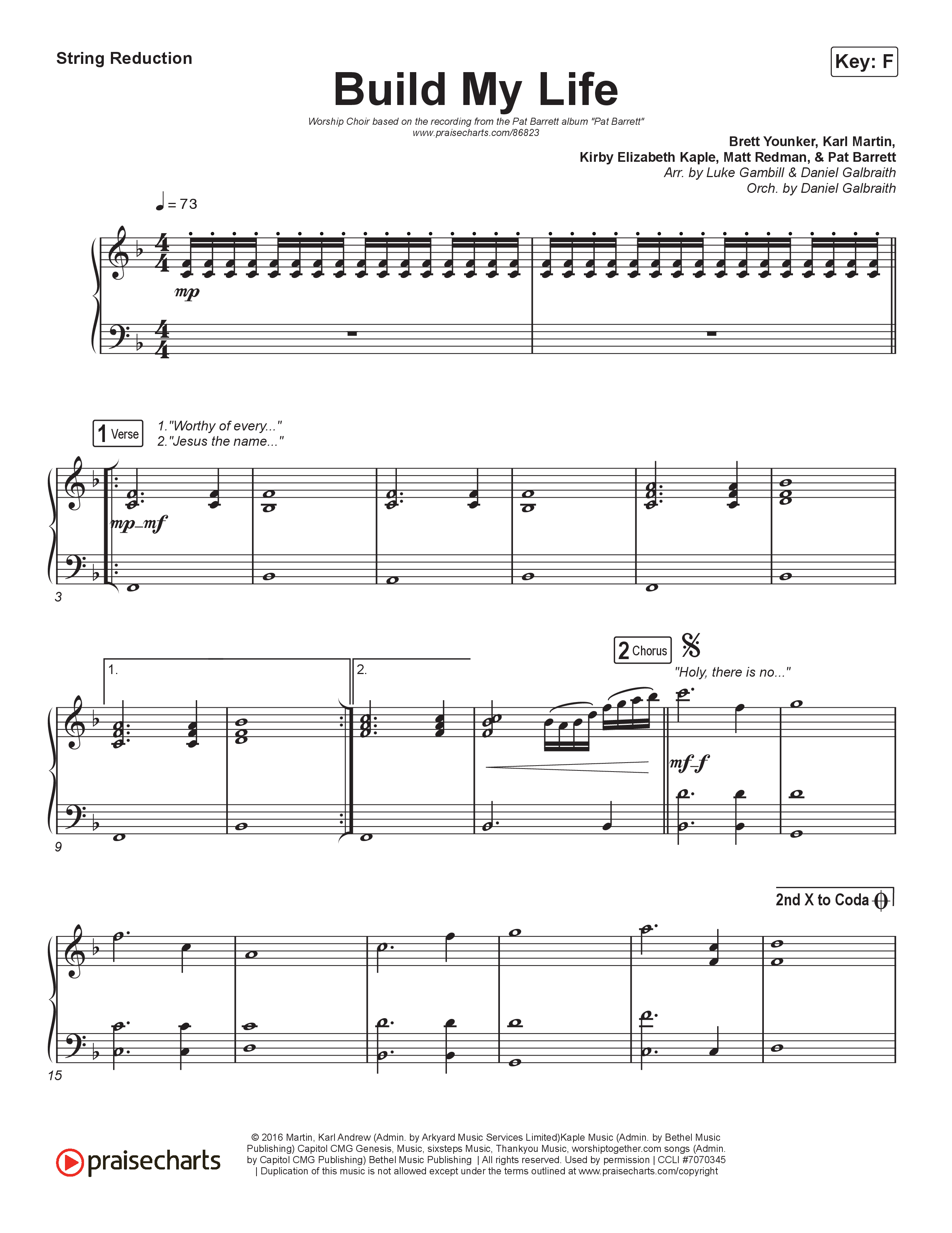 Download the String Reduction sheet music for Build My Life (Worship Choir/SAB) by Pat Barrett / Arr. Luke Gambill, from the album Pat Barrett. This song was arranged by Luke Gambill / Daniel Galbraith / Dave Iula in the key of F.