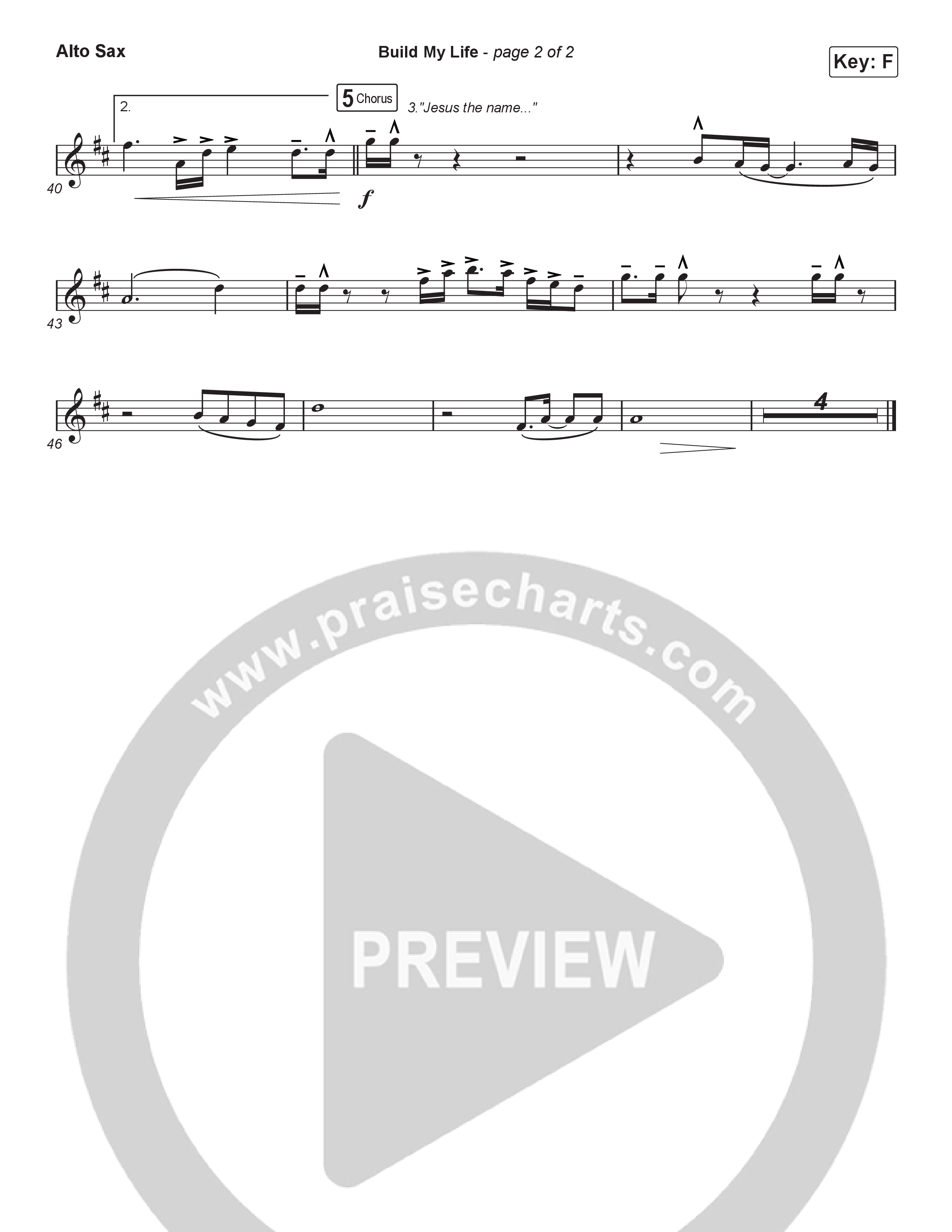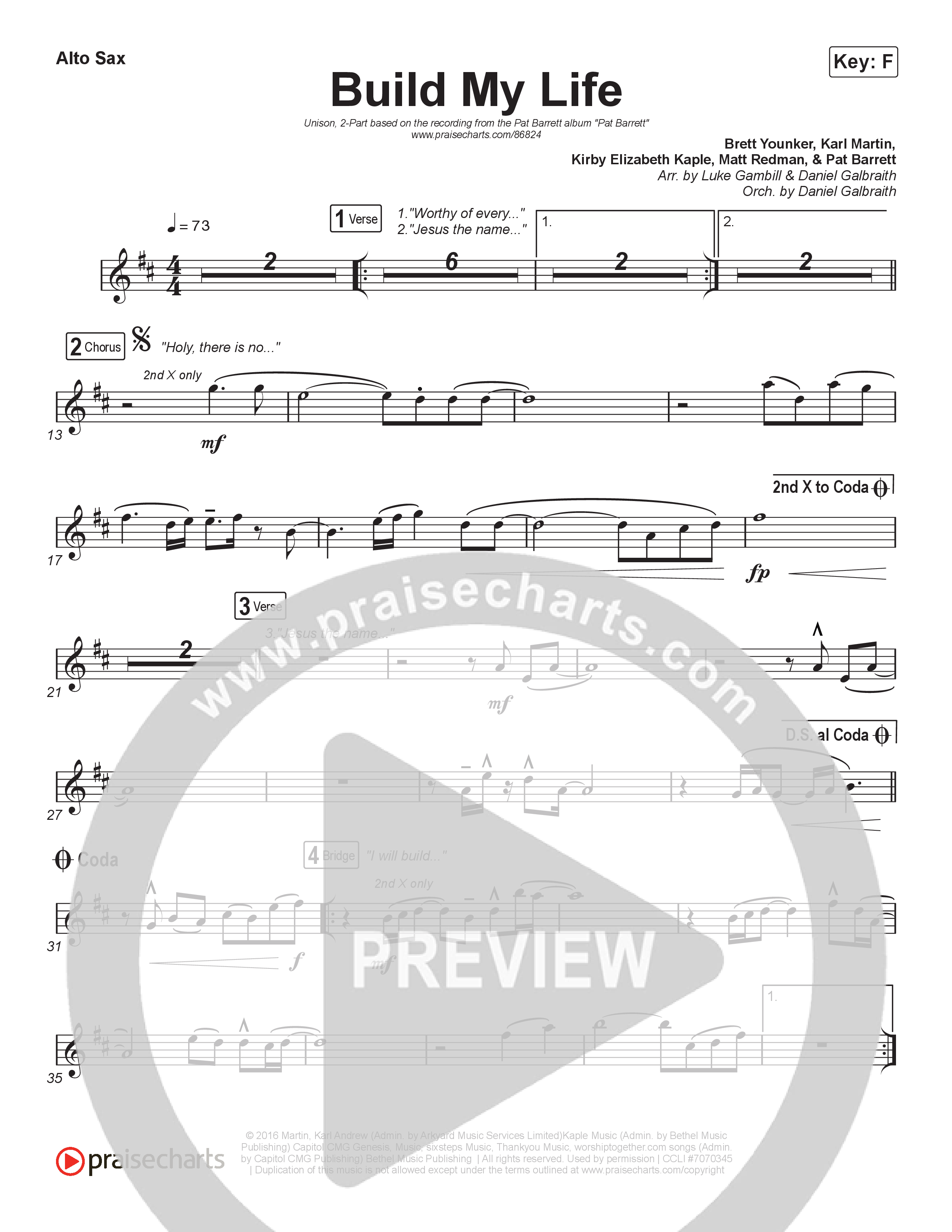 Download the AltoSax sheet music for Build My Life (Unison/2-Part) by Pat Barrett / Arr. Luke Gambill, from the album Pat Barrett. This song was arranged by Luke Gambill / Daniel Galbraith / Dave Iula in the key of F.