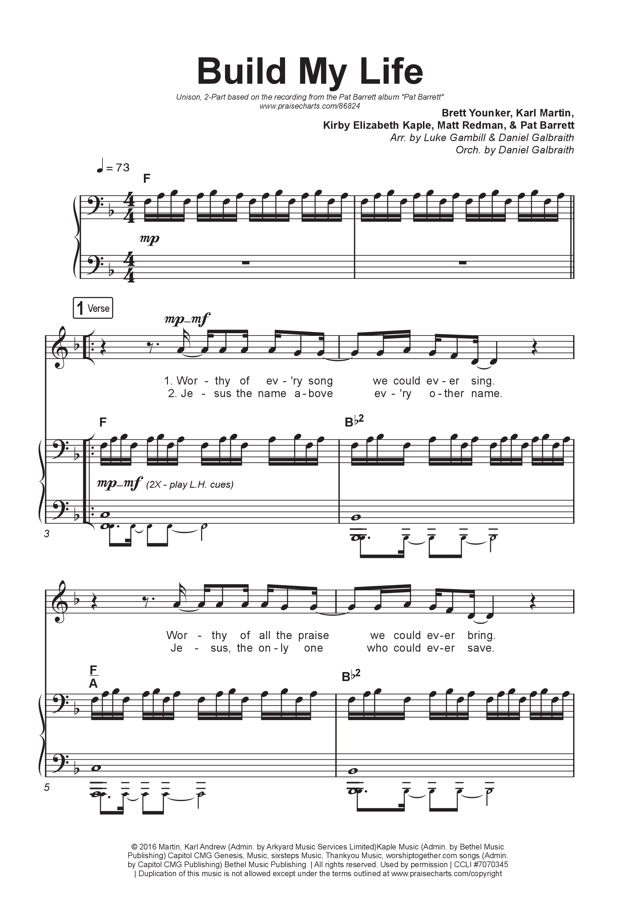 Download the Octavo sheet music for Build My Life (Unison/2-Part) by Pat Barrett / Arr. Luke Gambill, from the album Pat Barrett. This song was arranged by Luke Gambill / Daniel Galbraith / Dave Iula in the key of F.