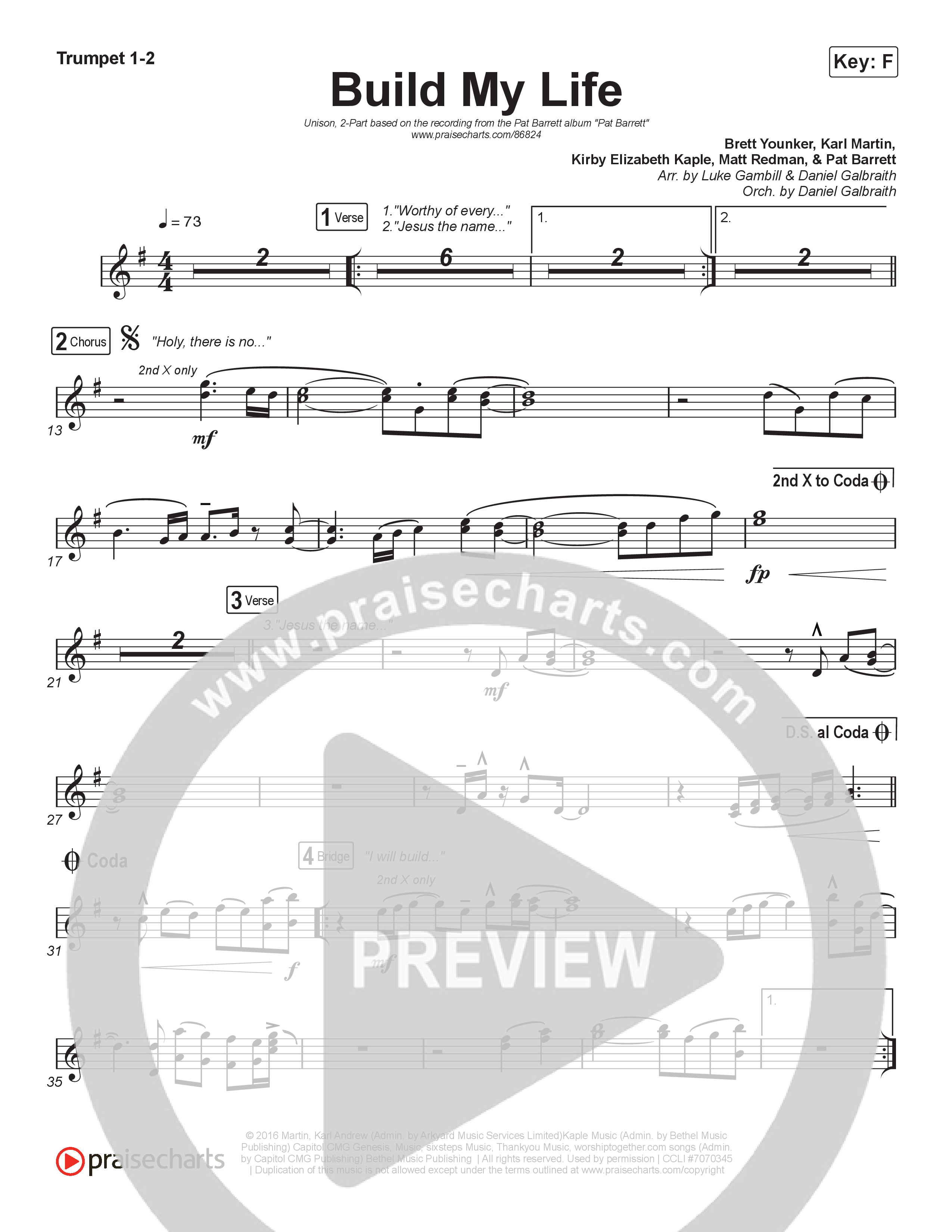 Download the trumpet sheet music for Build My Life (Unison/2-Part) by Pat Barrett / Arr. Luke Gambill, from the album Pat Barrett. This song was arranged by Luke Gambill / Daniel Galbraith / Dave Iula in the key of F.
