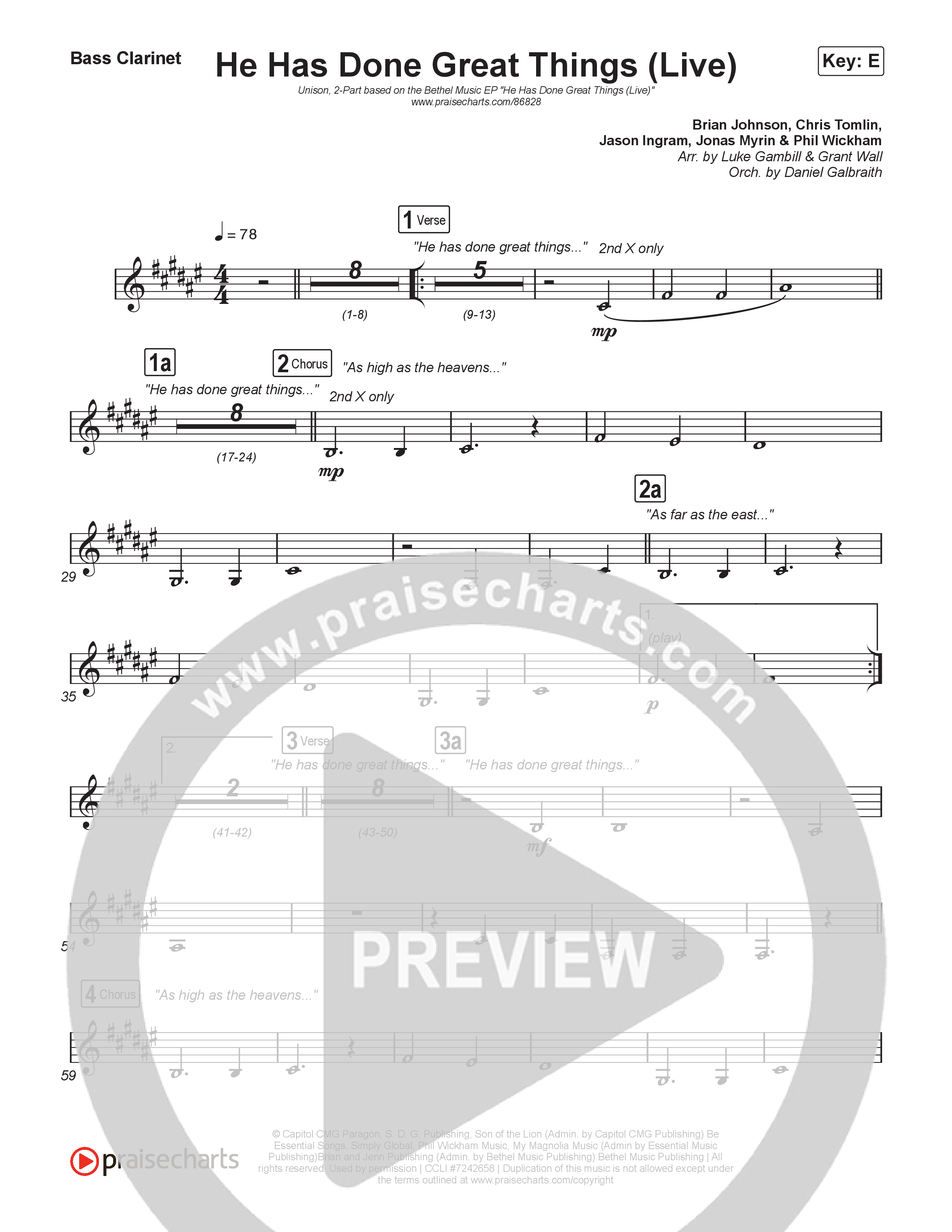 Download the Bass Clarinet sheet music for He Has Done Great Things (Unison/2-Part) by Bethel Music / Brian Johnson / Arr. Luke Gambill, from the album We Must Respond. This song was arranged by Luke Gambill / Daniel Galbraith / Grant Wall in the key of E.
