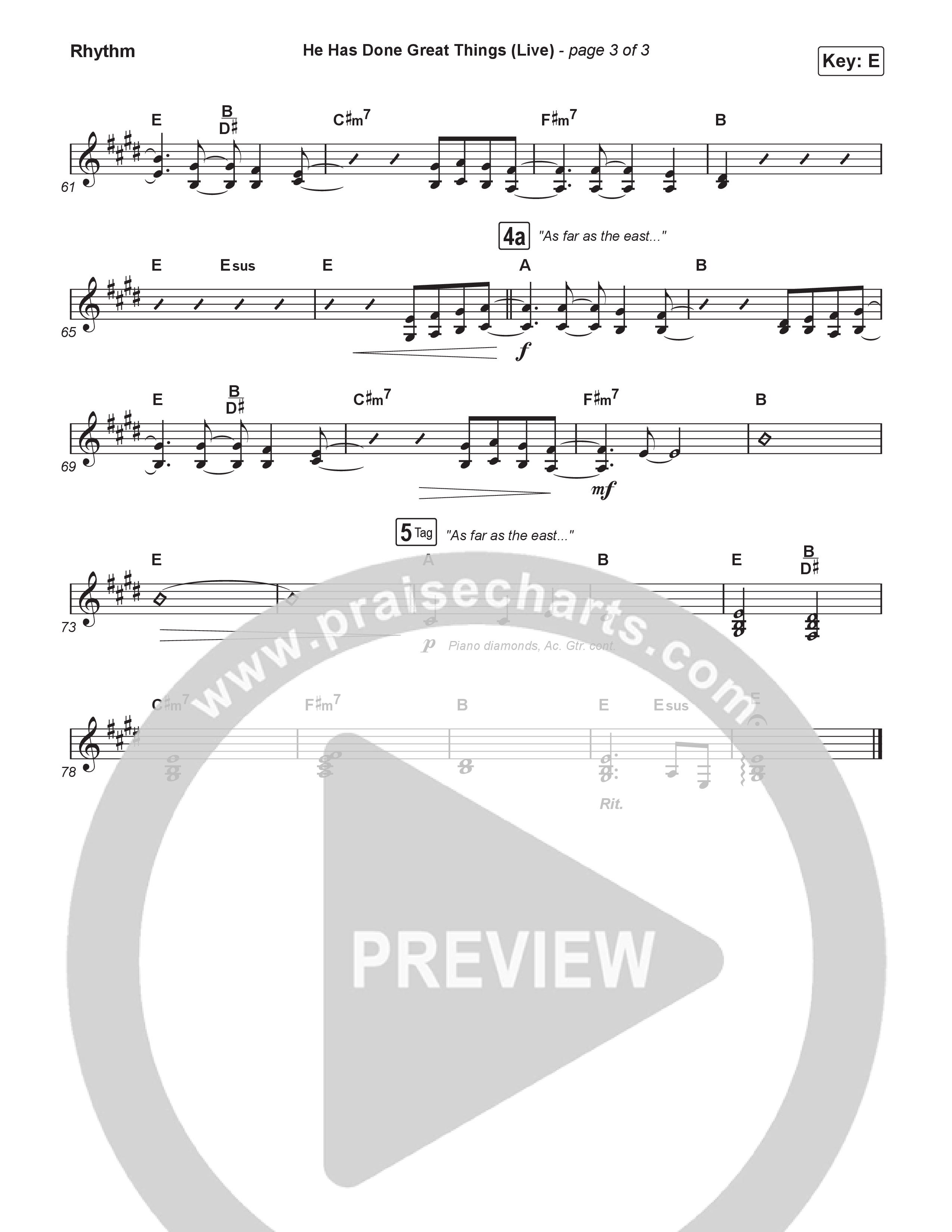 Download the Rhythm Chart for He Has Done Great Things (Unison/2-Part) by Bethel Music / Brian Johnson / Arr. Luke Gambill, from the album We Must Respond. This song was arranged by Luke Gambill / Daniel Galbraith / Grant Wall in the key of E.