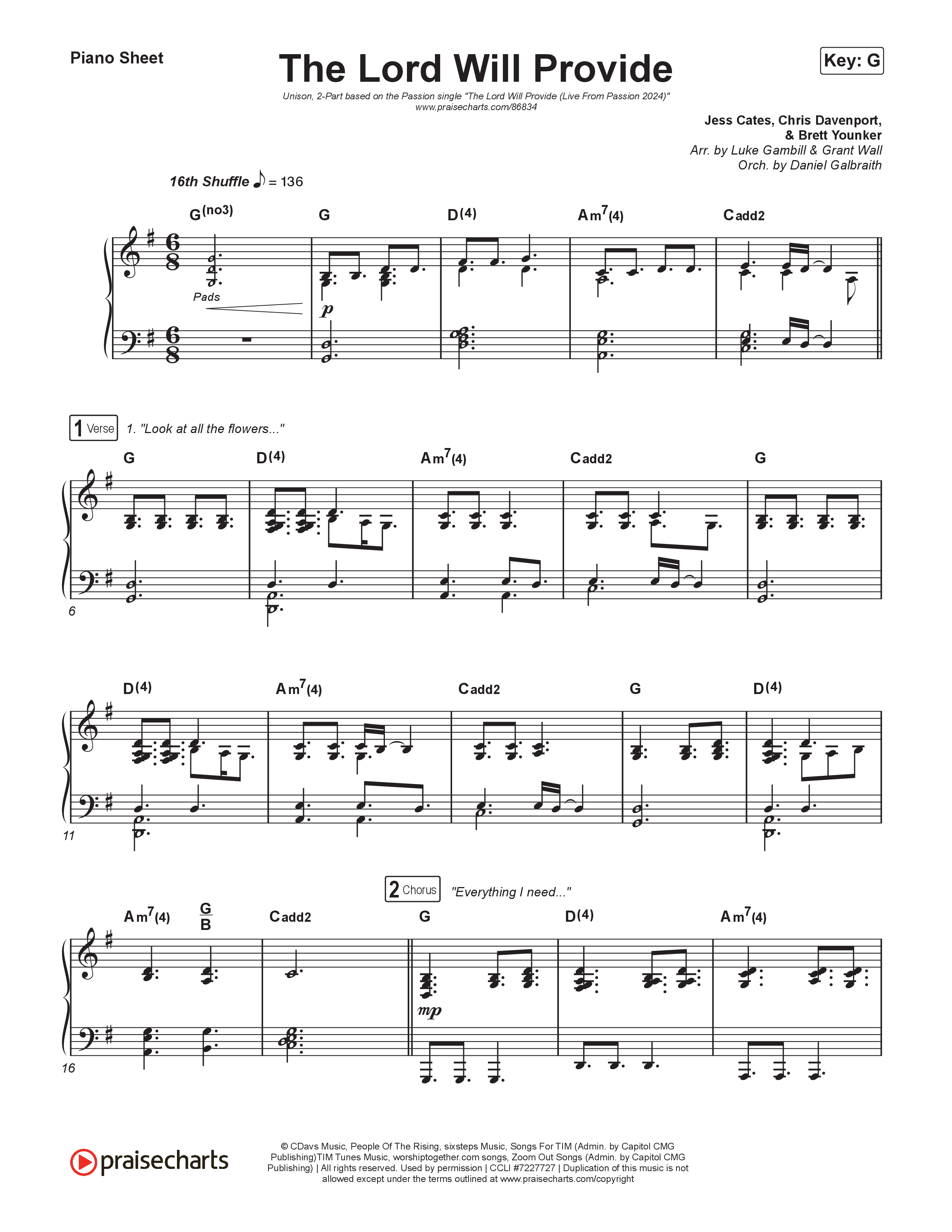 Download the piano sheet for The Lord Will Provide (Unison/2-Part) by Passion / Landon Wolfe / Arr. Luke Gambill, from the album Call On Heaven (Live From Passion 2024). This song was arranged by Luke Gambill / Daniel Galbraith / Grant Wall in the key of G.