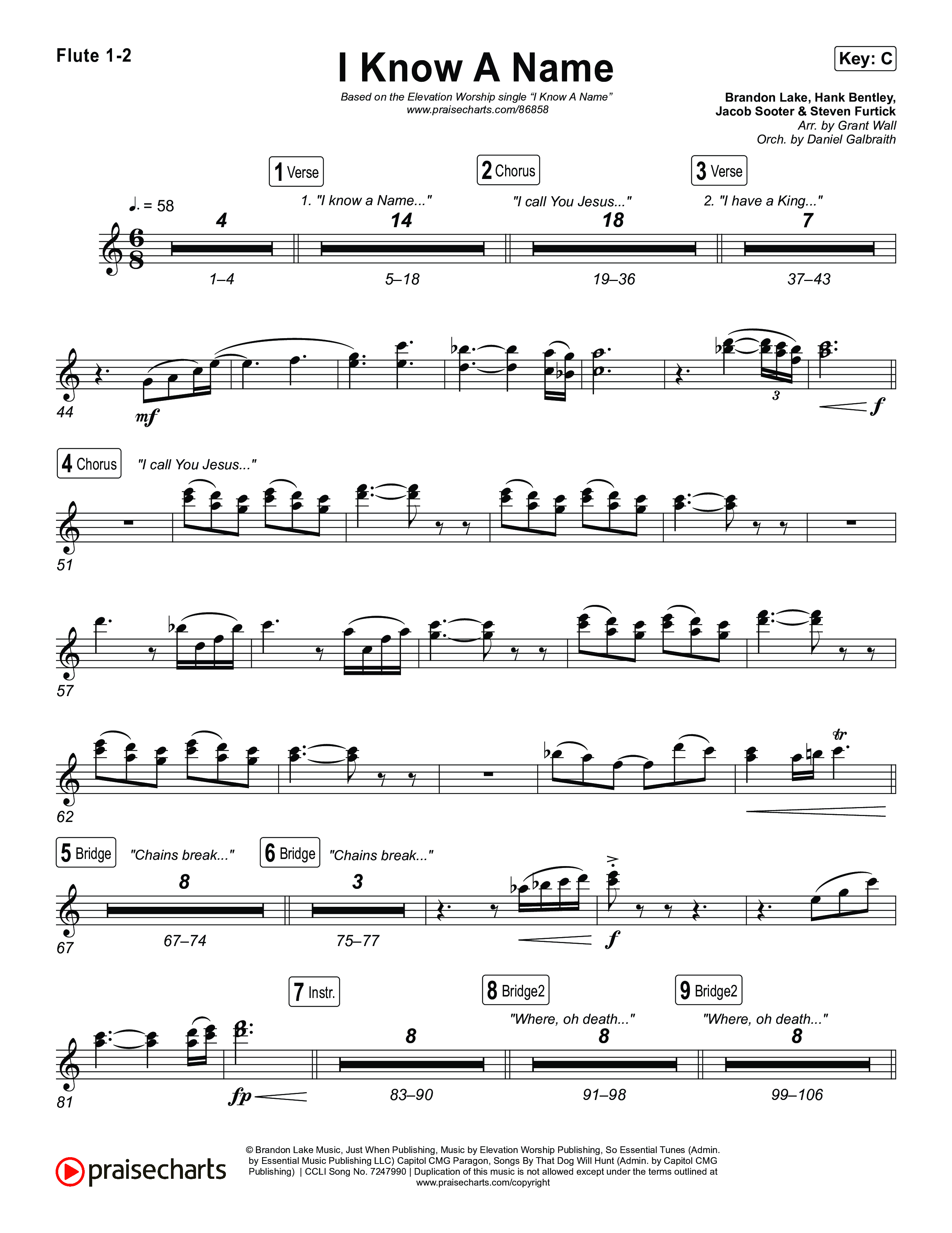 Download the Flute sheet music for I Know A Name by Elevation Worship / Chris Brown / Brandon Lake, from the album I Know A Name. This song was arranged by Grant Wall / Daniel Galbraith in the key of A, Ab, Bb, C, F, G.