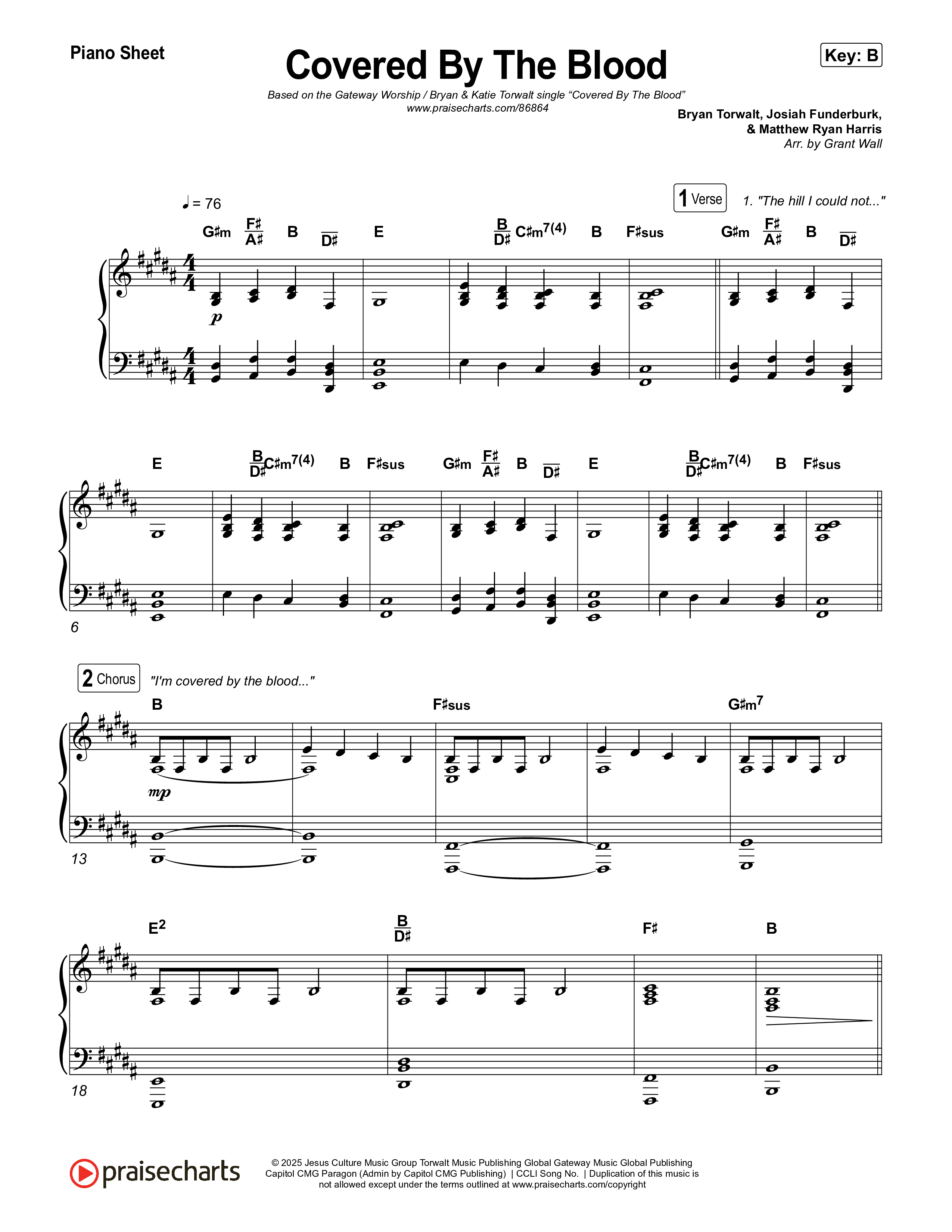 Download the piano sheet for Covered By The Blood (Live) by Gateway Worship / Bryan & Katie Torwalt, from the album Covered By The Blood. This song was arranged by Grant Wall in the key of B, Bb.