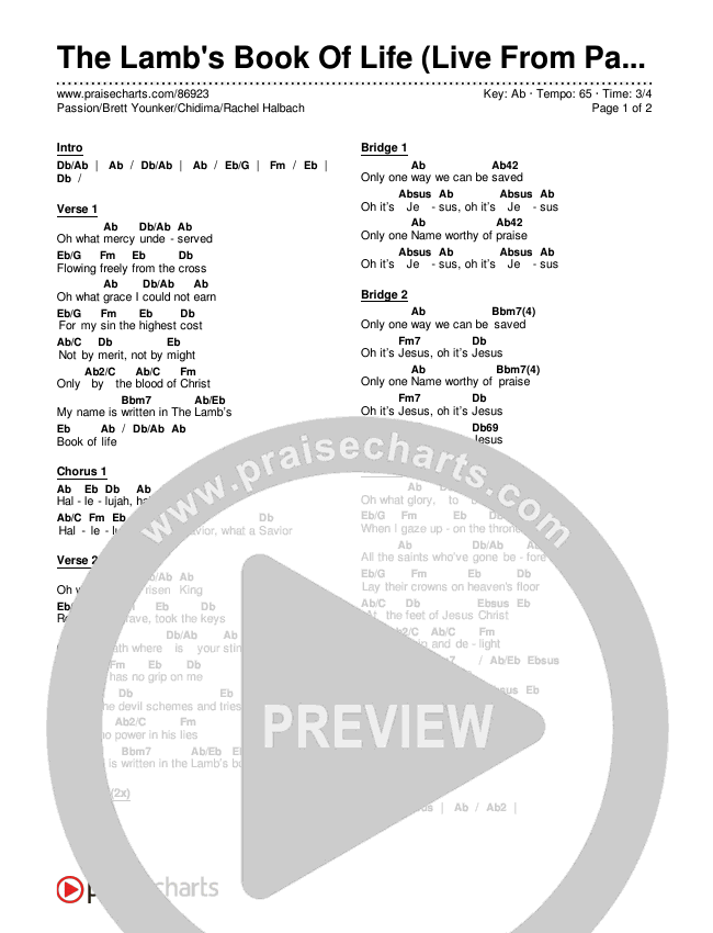 Download the PDF Chord Charts for The Lamb's Book Of Life (Live From Passion 2025) by Passion / Brett Younker / Chidima / Rachel Halbach, from the album Call On Heaven (Come Lord Jesus). This song was arranged by Grant Wall / Daniel Galbraith in the key of Ab, G.