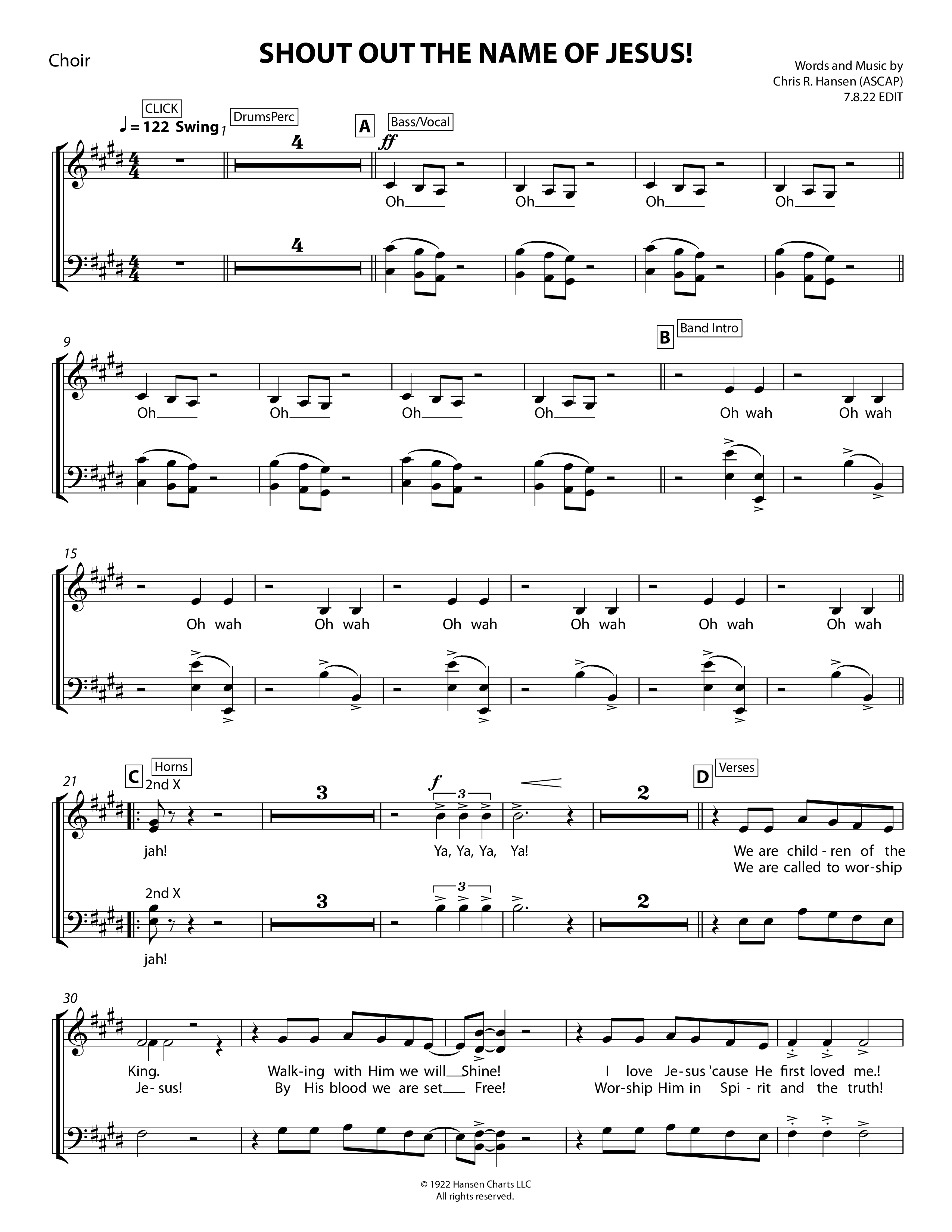 Download the Choir Sheet for Shout Out The Name Of Jesus by Chris Hansen, from the album Songs Of Chris Hansen. This song was arranged by Chris Hansen in the key of E.