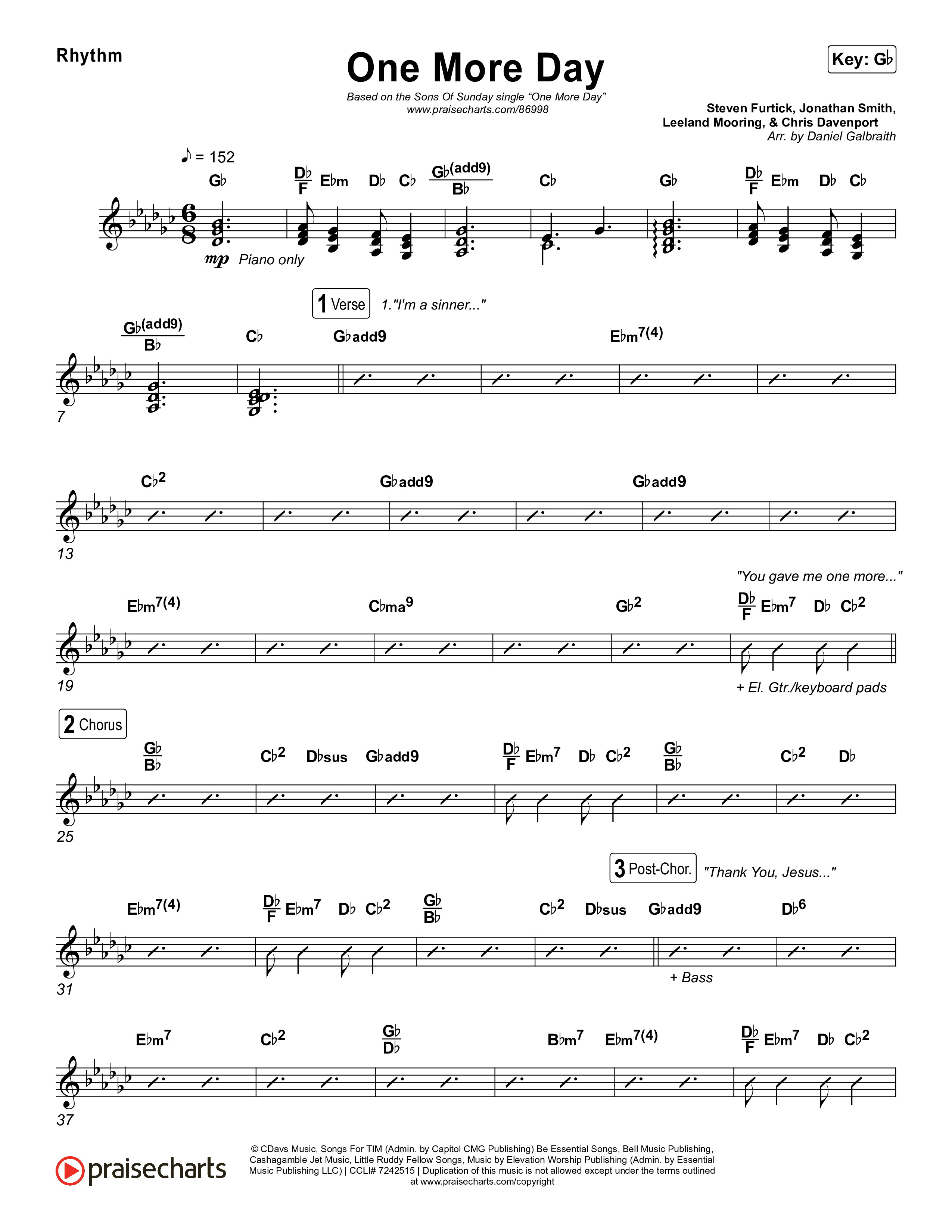 Download the PDF sheet music for One More Day by Sons Of Sunday, from the album Sons Of Sunday. This song was arranged by Daniel Galbraith in the key of F, Gb.