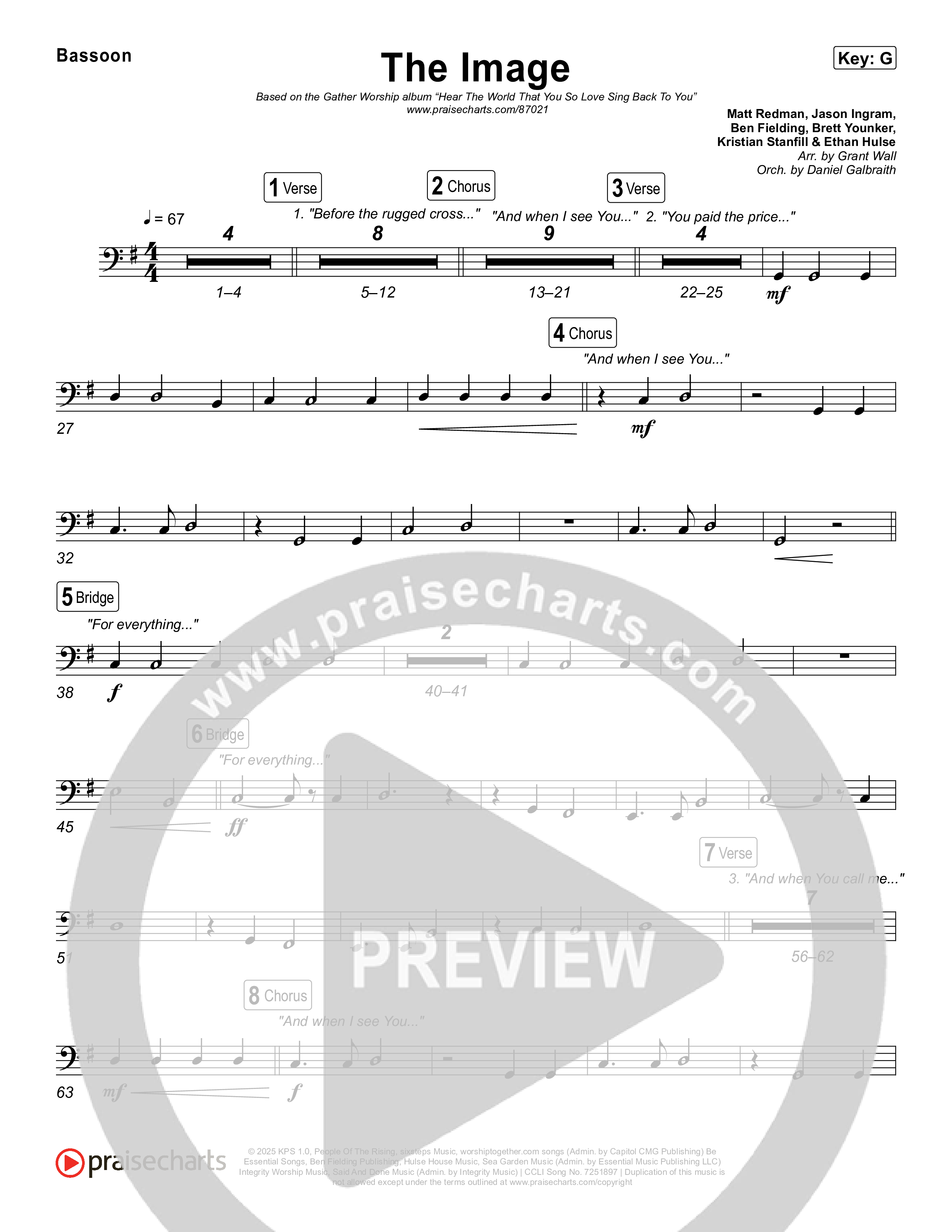 Download the Bassoon sheet music for The Image by Gather Worship / Matt Redman / kaestrings, from the album Hear The World That You So Love Sing Back To You. This song was arranged by Grant Wall / Daniel Galbraith in the key of F, G.
