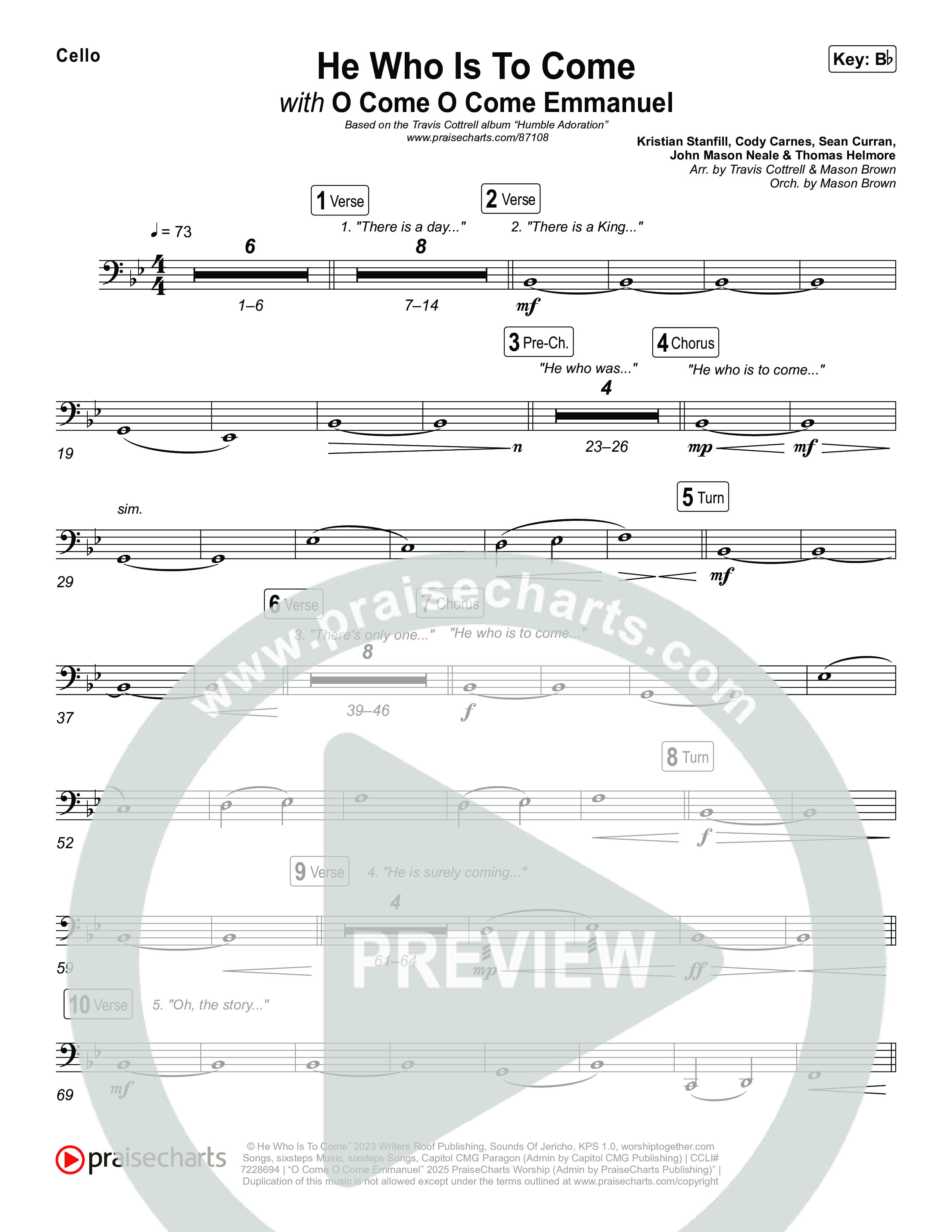Download the Cello sheet music for He Who Is To Come / O Come O Come Emmanuel (Choral/SATB) by Travis Cottrell / Brooke Voland / Arr. Mason Brown, from the album Humble Adoration. This song was arranged by Travis Cottrell / Mason Brown in the key of Bb.