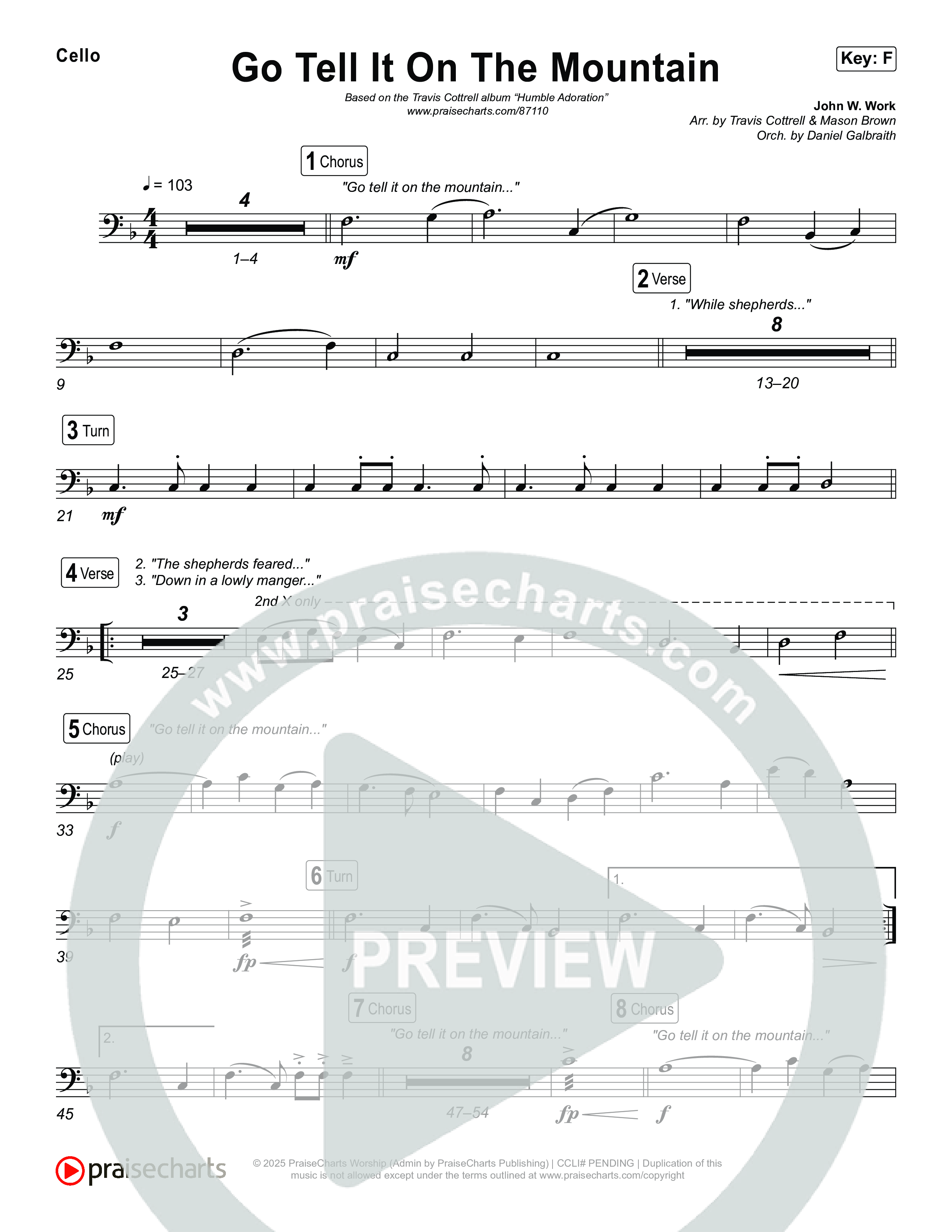 Download the Cello sheet music for Go Tell It On The Mountain (Choral/SATB) by Travis Cottrell / Arr. Mason Brown / Orch. Daniel Galbraith, from the album Humble Adoration. This song was arranged by Travis Cottrell / Mason Brown / Daniel Galbraith in the key of F.