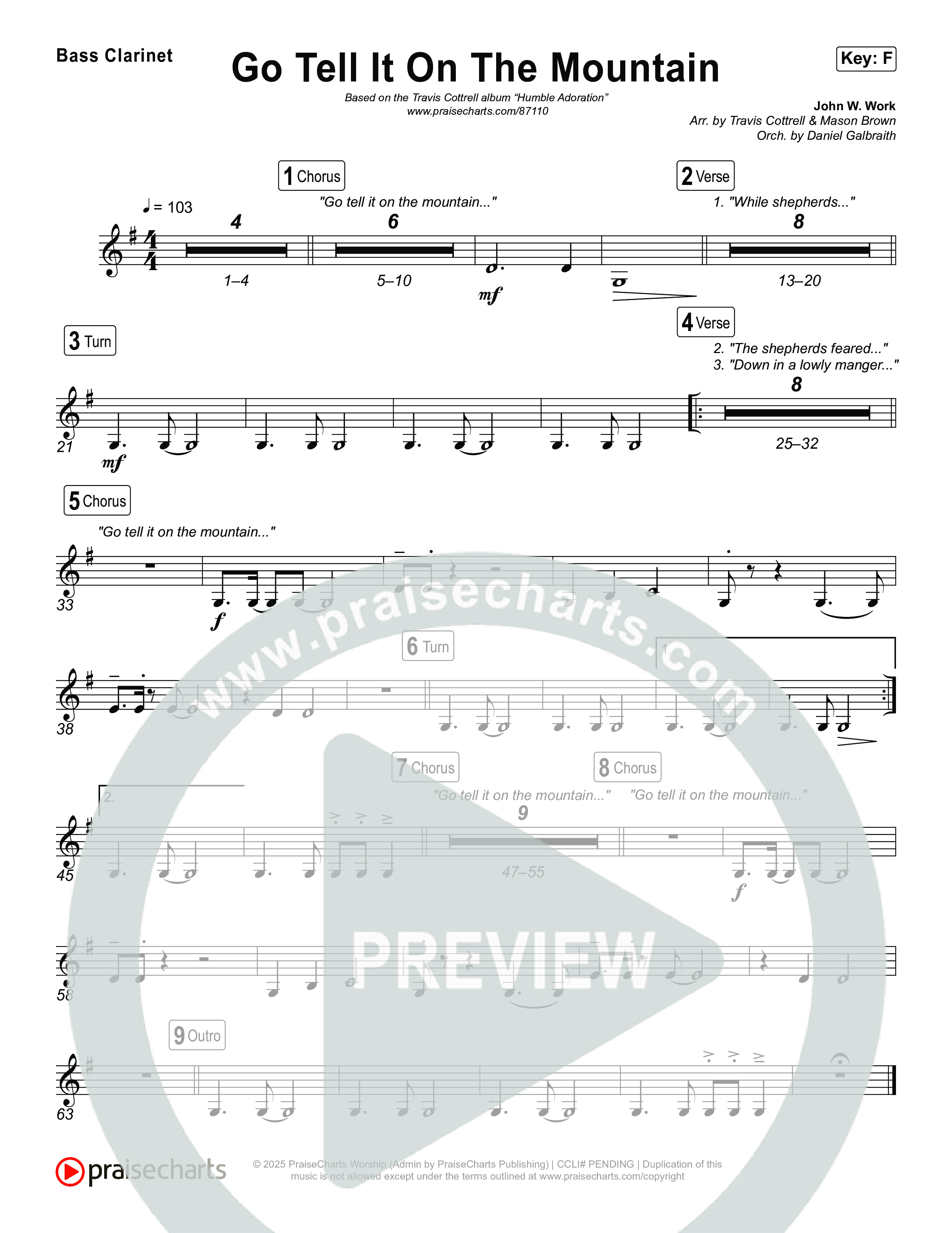 Download the Clarinet sheet music for Go Tell It On The Mountain (Choral/SATB) by Travis Cottrell / Arr. Mason Brown / Orch. Daniel Galbraith, from the album Humble Adoration. This song was arranged by Travis Cottrell / Mason Brown / Daniel Galbraith in the key of F.