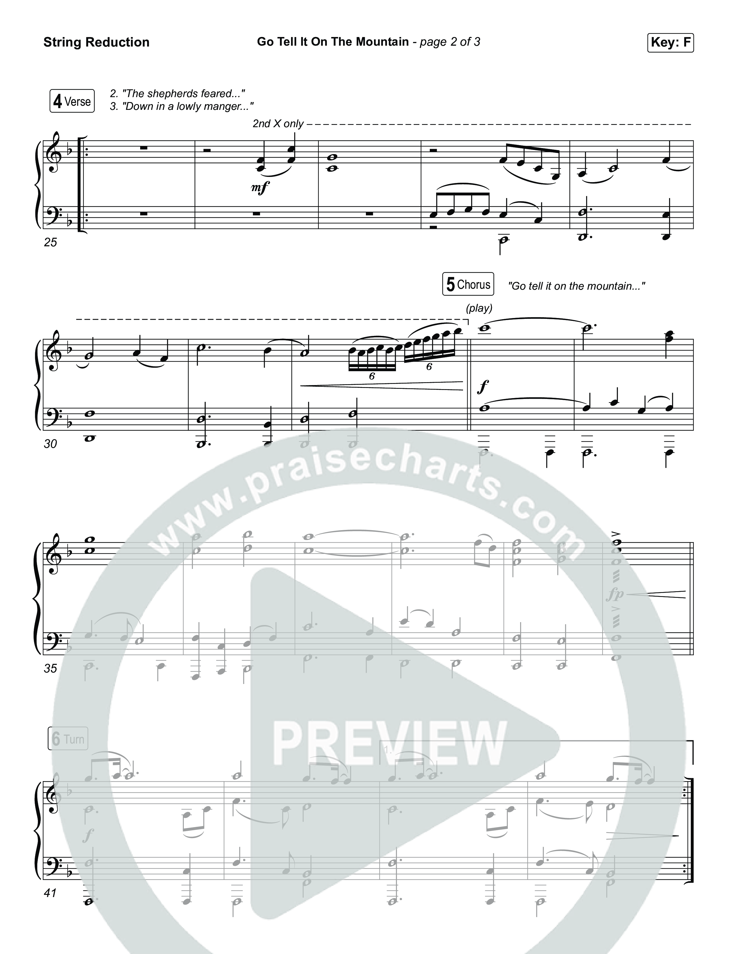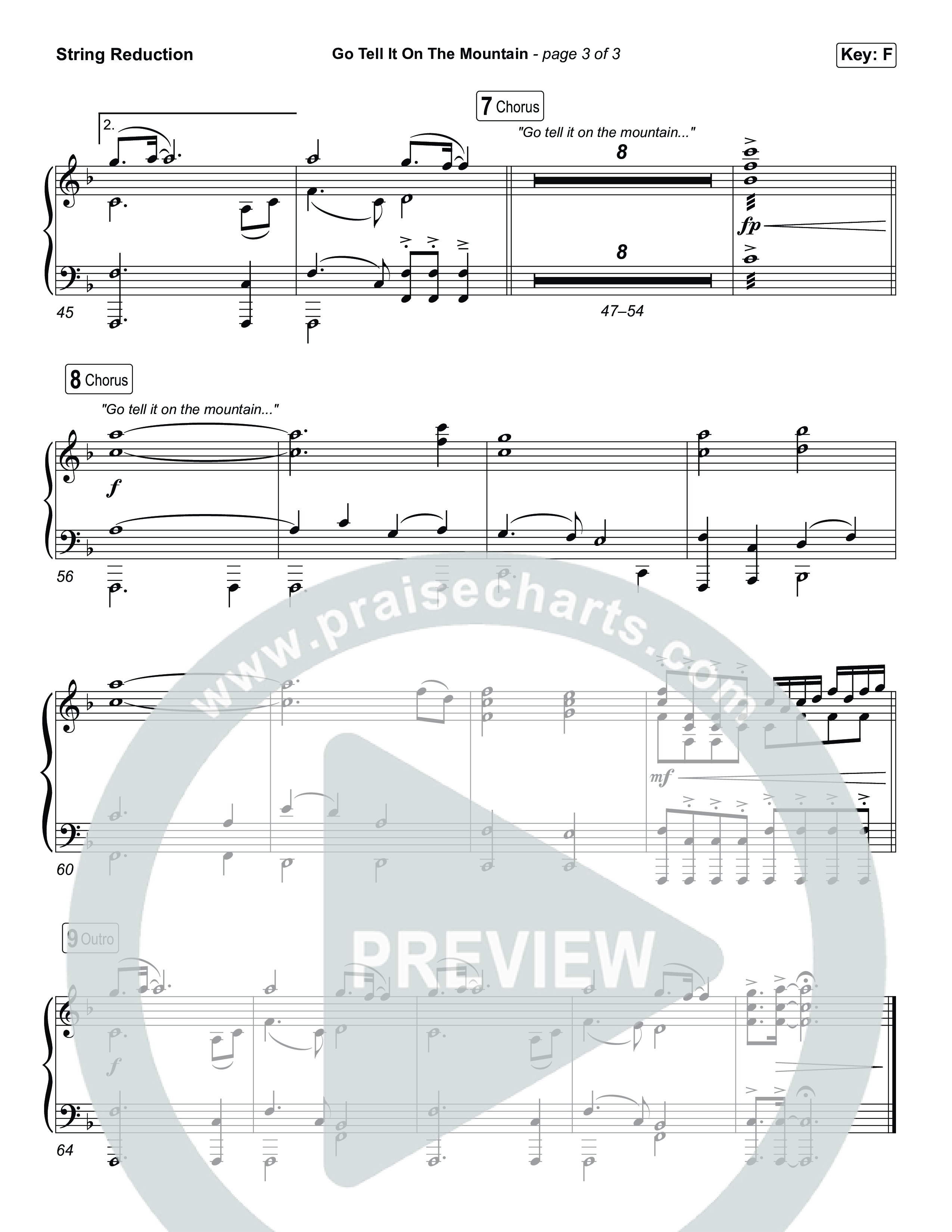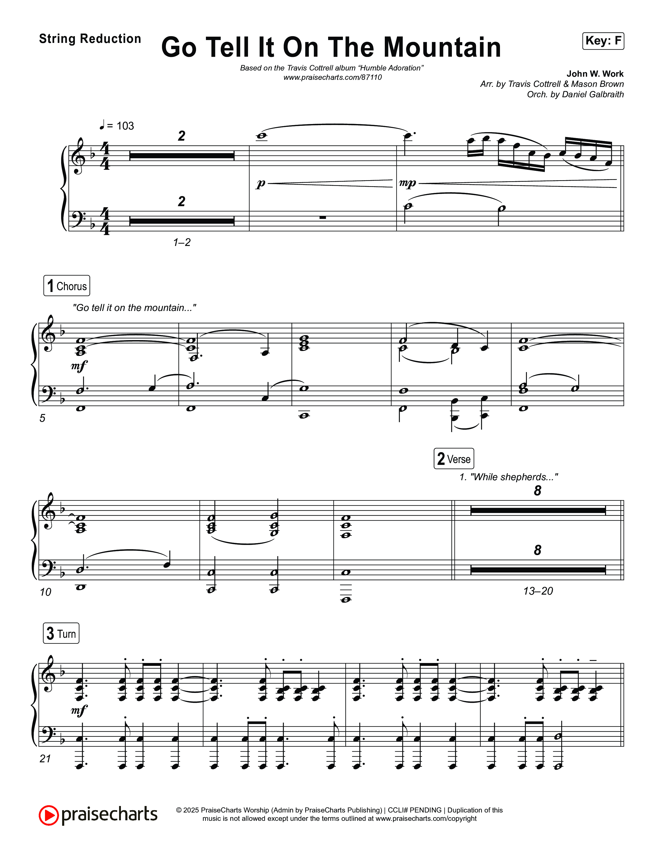 Download the String Reduction sheet music for Go Tell It On The Mountain (Choral/SATB) by Travis Cottrell / Arr. Mason Brown / Orch. Daniel Galbraith, from the album Humble Adoration. This song was arranged by Travis Cottrell / Mason Brown / Daniel Galbraith in the key of F.