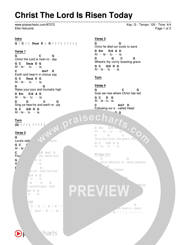 Download the PDF Chord Charts for Christ The Lord Is Risen Today by Ellie Holcomb, from the album Sing: Spring Sings. This song was arranged by Grant Wall in the key of A, G.