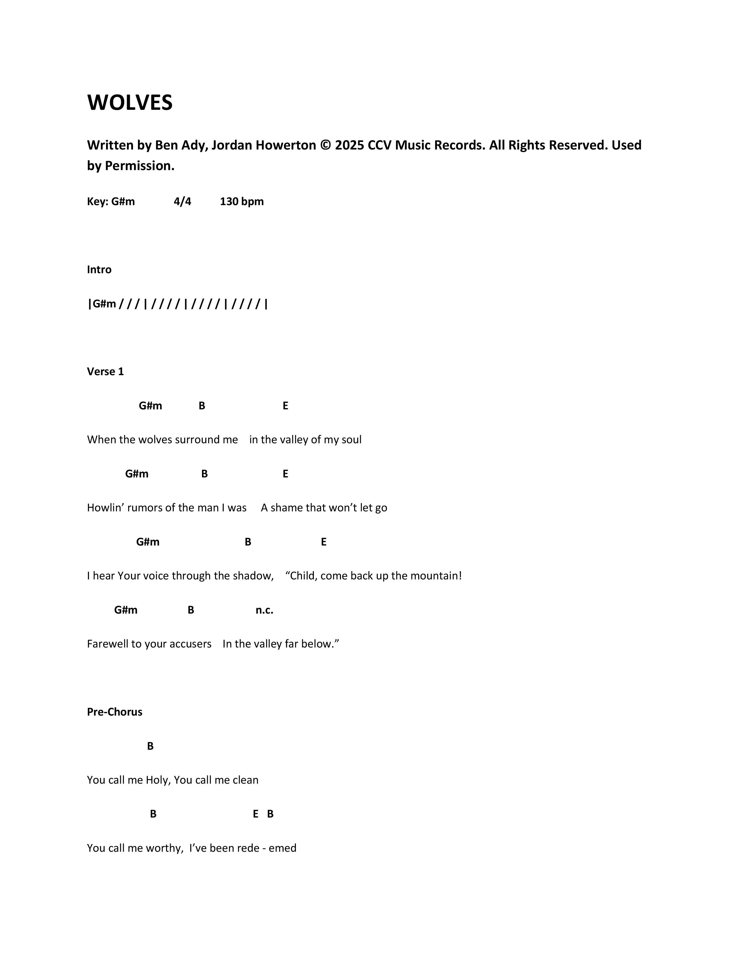 Download the PDF Chord Charts for Wolves by CCV Music, from the album Hollow.