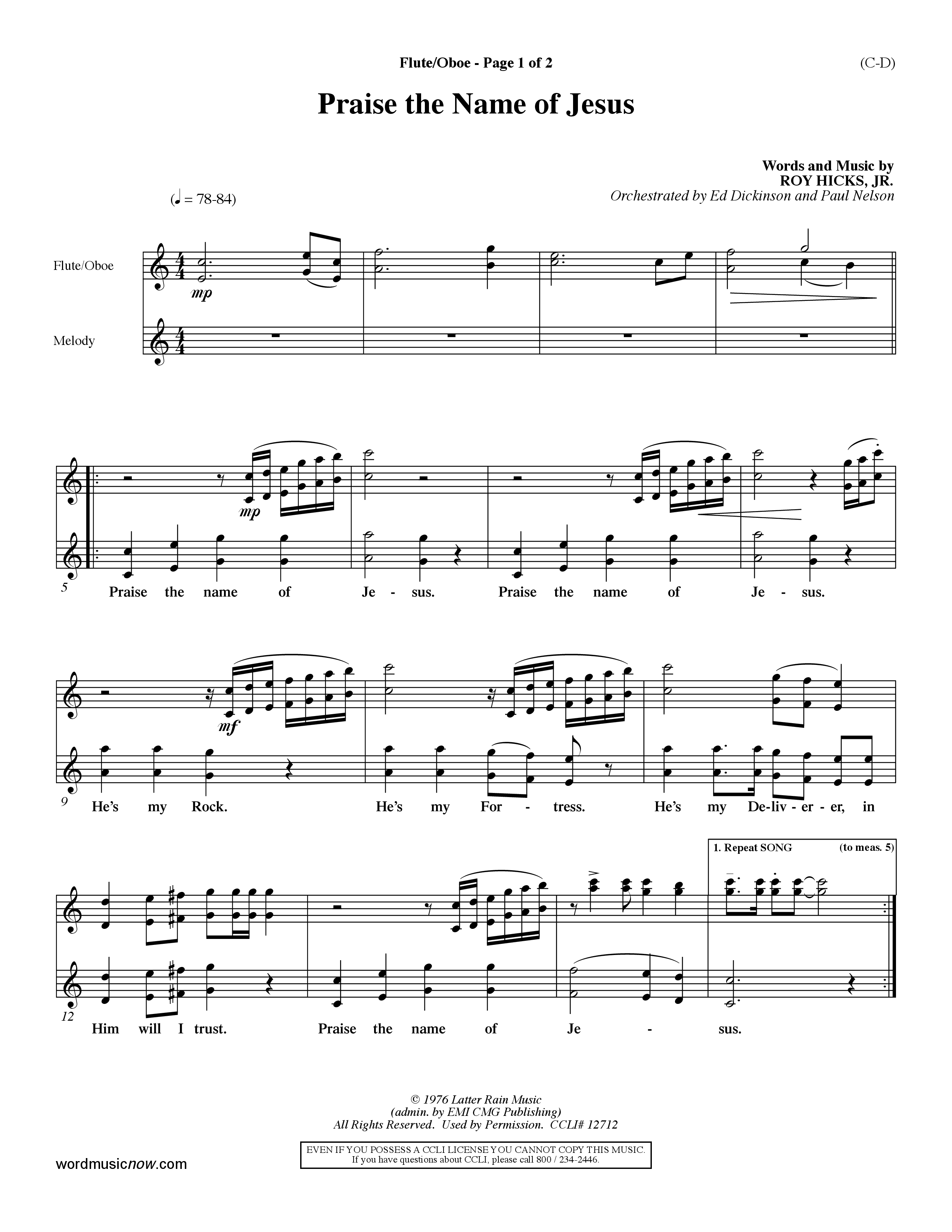 Download the Oboe sheet music for Praise The Name Of Jesus (Choral Anthem SATB) by Word Music Choral / Orch. Ed Dickinson / Orch. Paul Nelson, from the album Songs for Praise & Worship. This song was arranged by Ed Dickinson / Paul Nelson in the key of C, Eb.