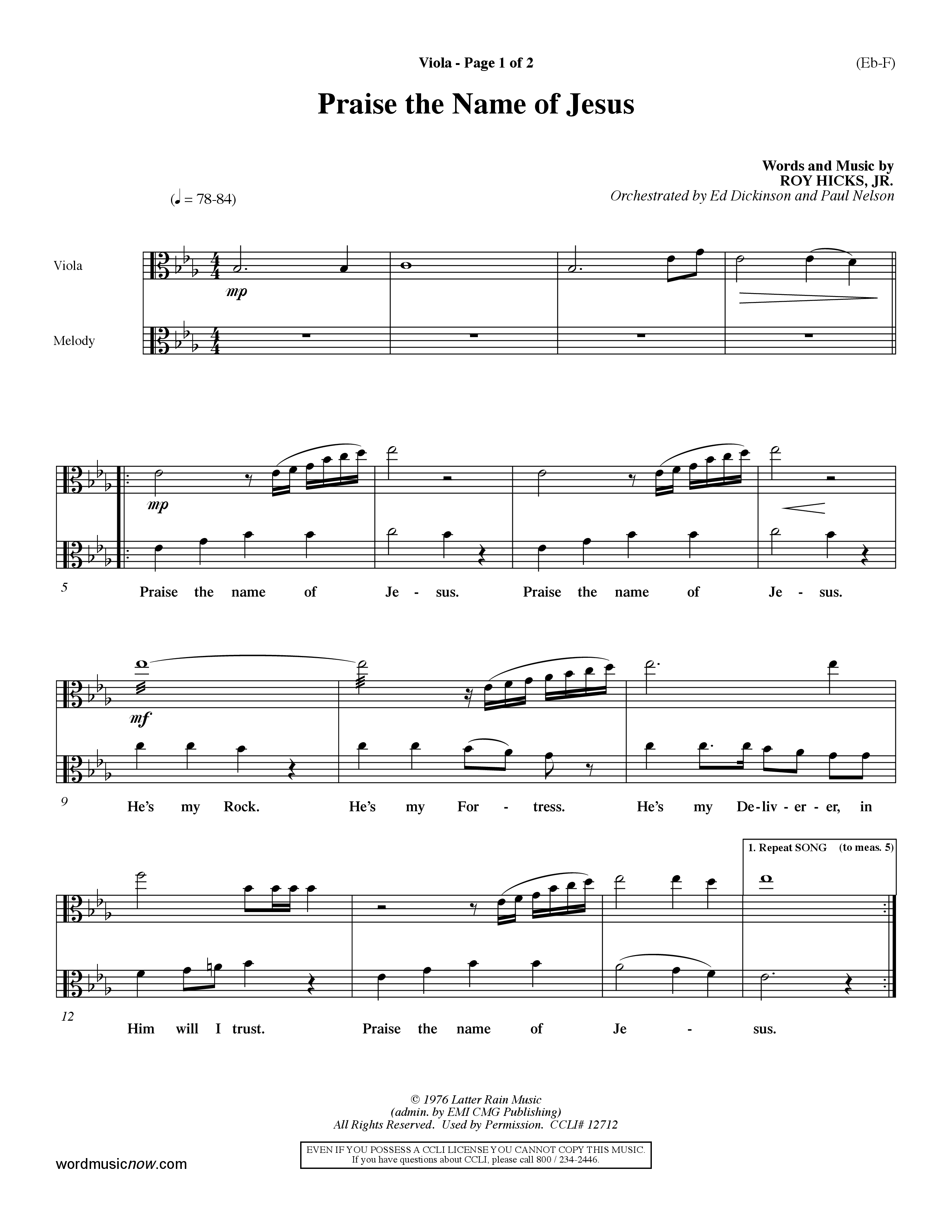 Download the Viola sheet music for Praise The Name Of Jesus (Choral Anthem SATB) by Word Music Choral / Orch. Ed Dickinson / Orch. Paul Nelson, from the album Songs for Praise & Worship. This song was arranged by Ed Dickinson / Paul Nelson in the key of C, Eb.