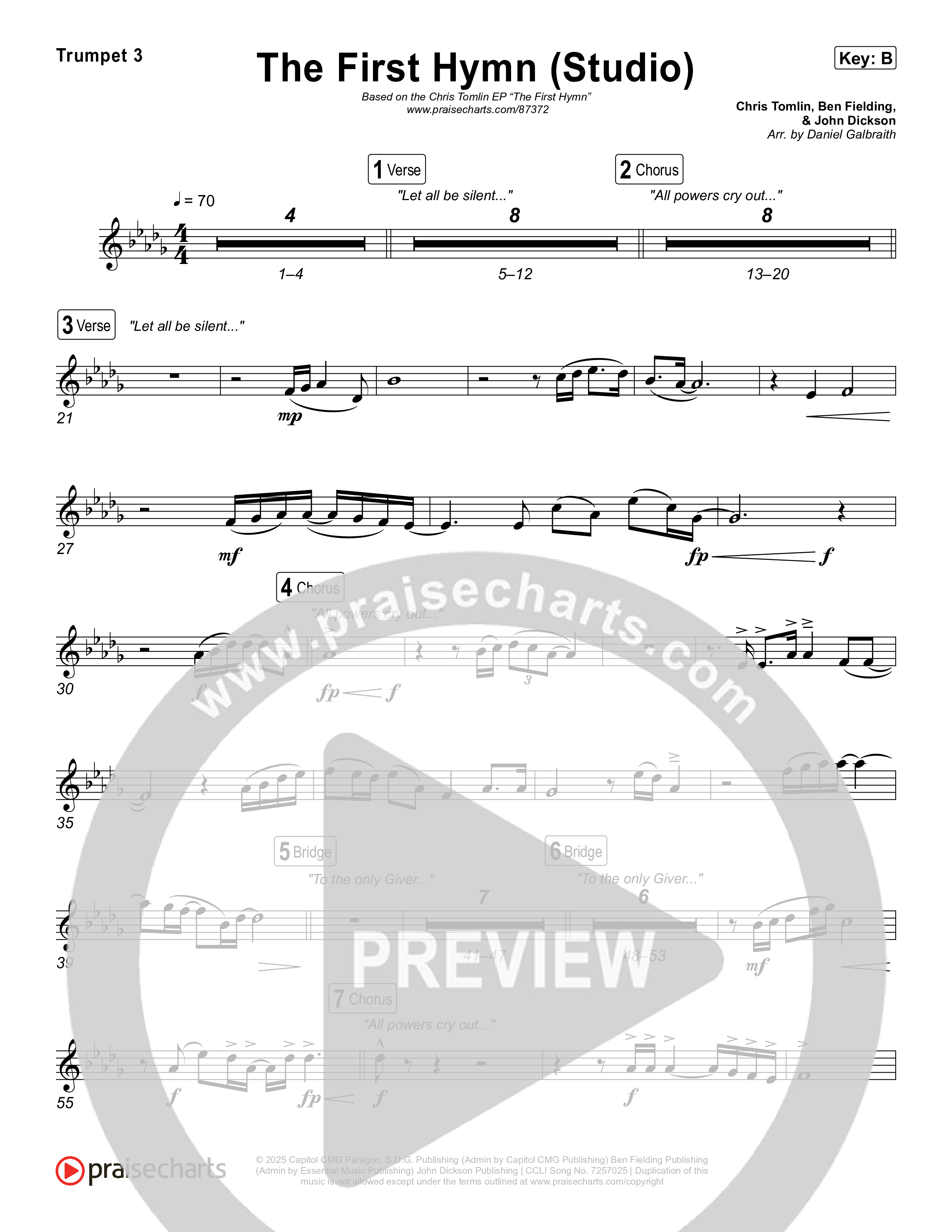 Download the Trumpet 3 sheet music for The First Hymn by Chris Tomlin / Ben Fielding, from the album The King Is Still The King. This song was arranged by Daniel Galbraith in the key of A, Ab, B, Bb, G.