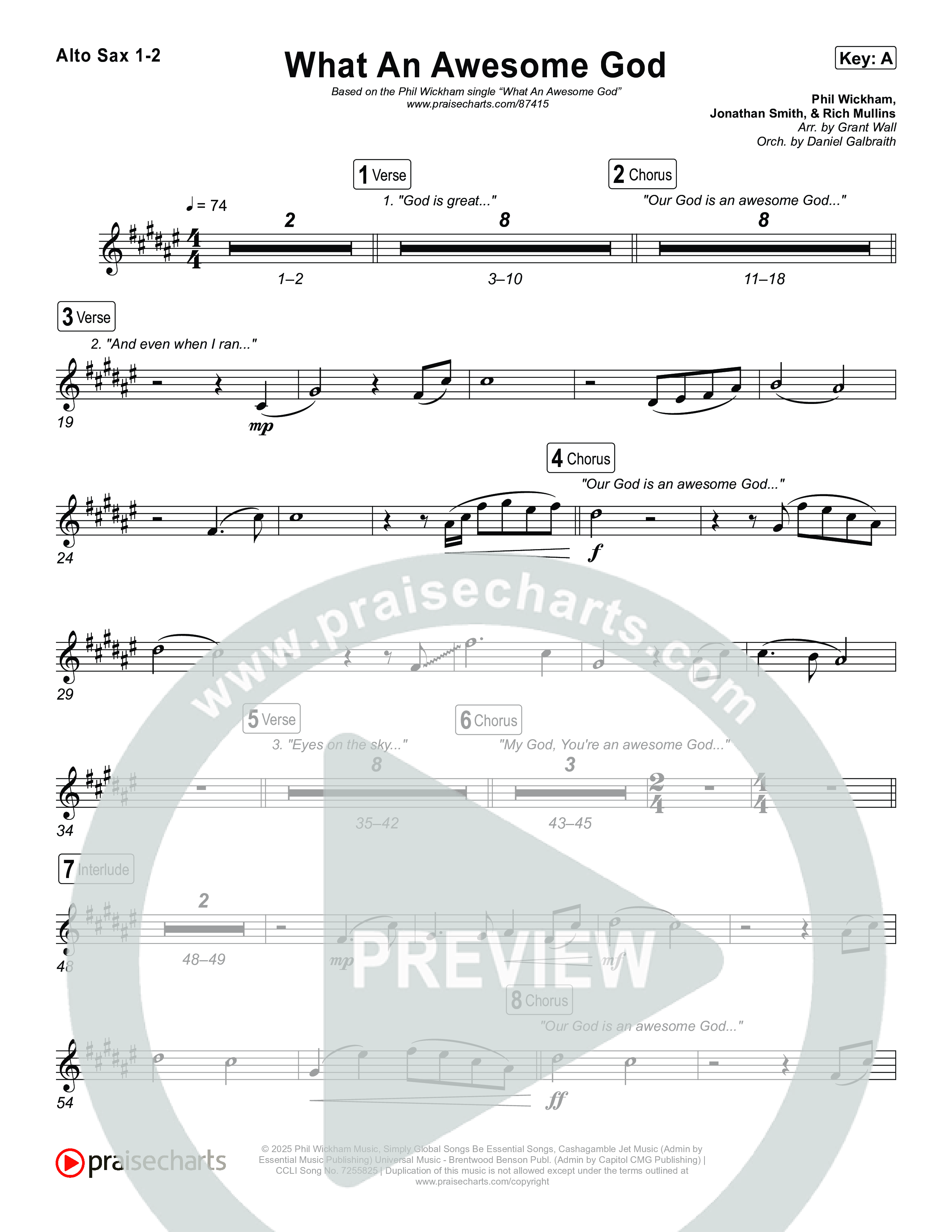 Download the Alto Sax 1,2 sheet music for What An Awesome God by Phil Wickham, from the album Song Of The Saints. This song was arranged by Grant Wall / Daniel Galbraith in the key of A, Ab, D, E, Eb, F, G.