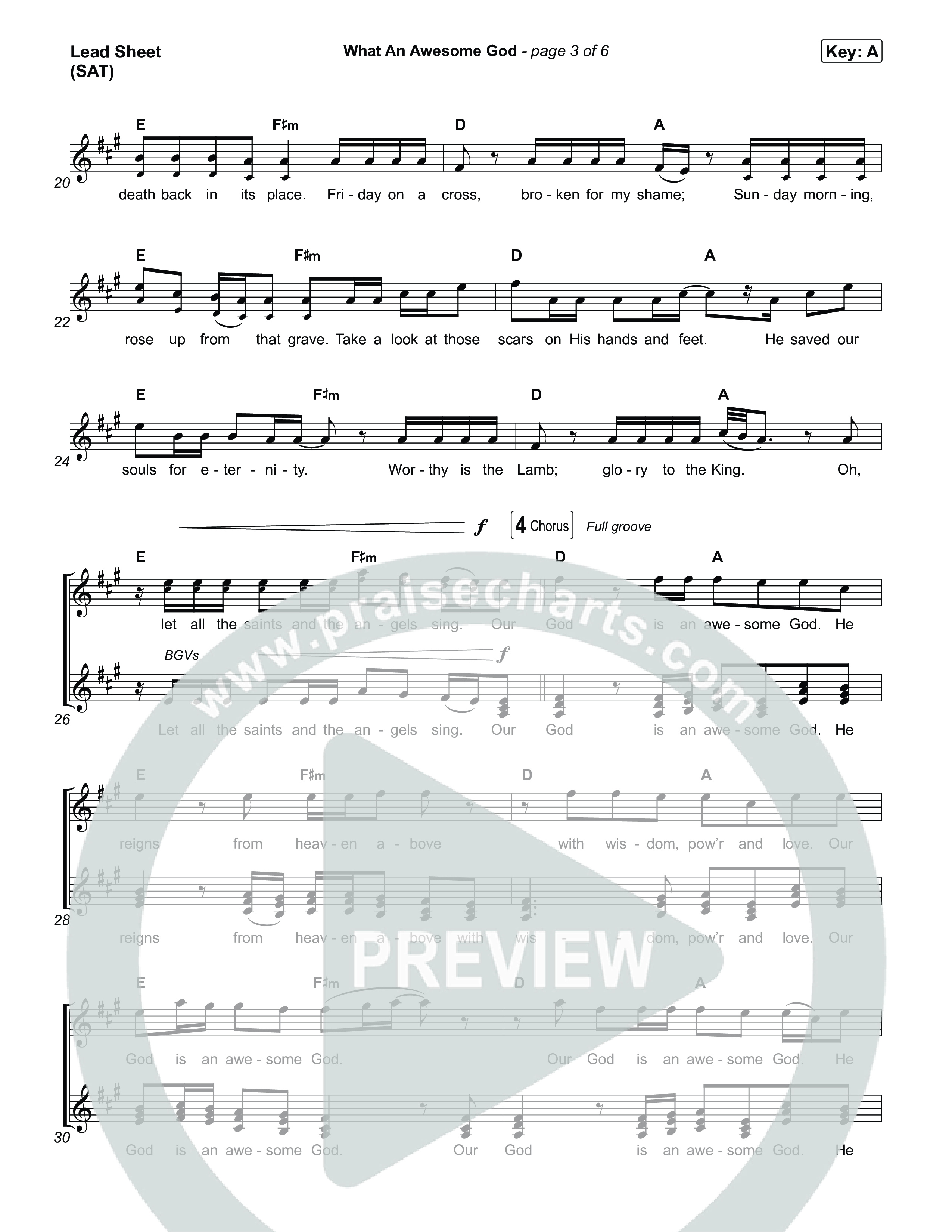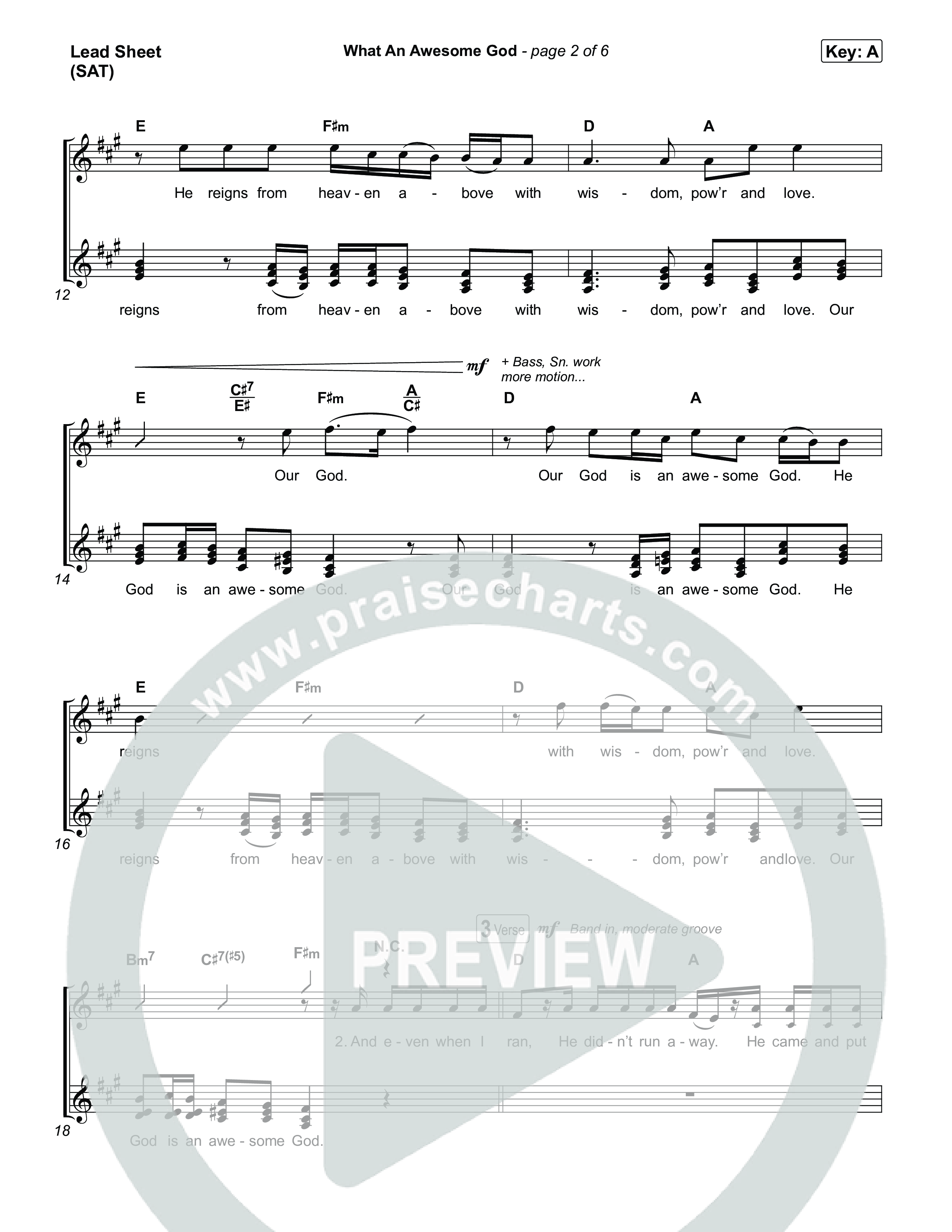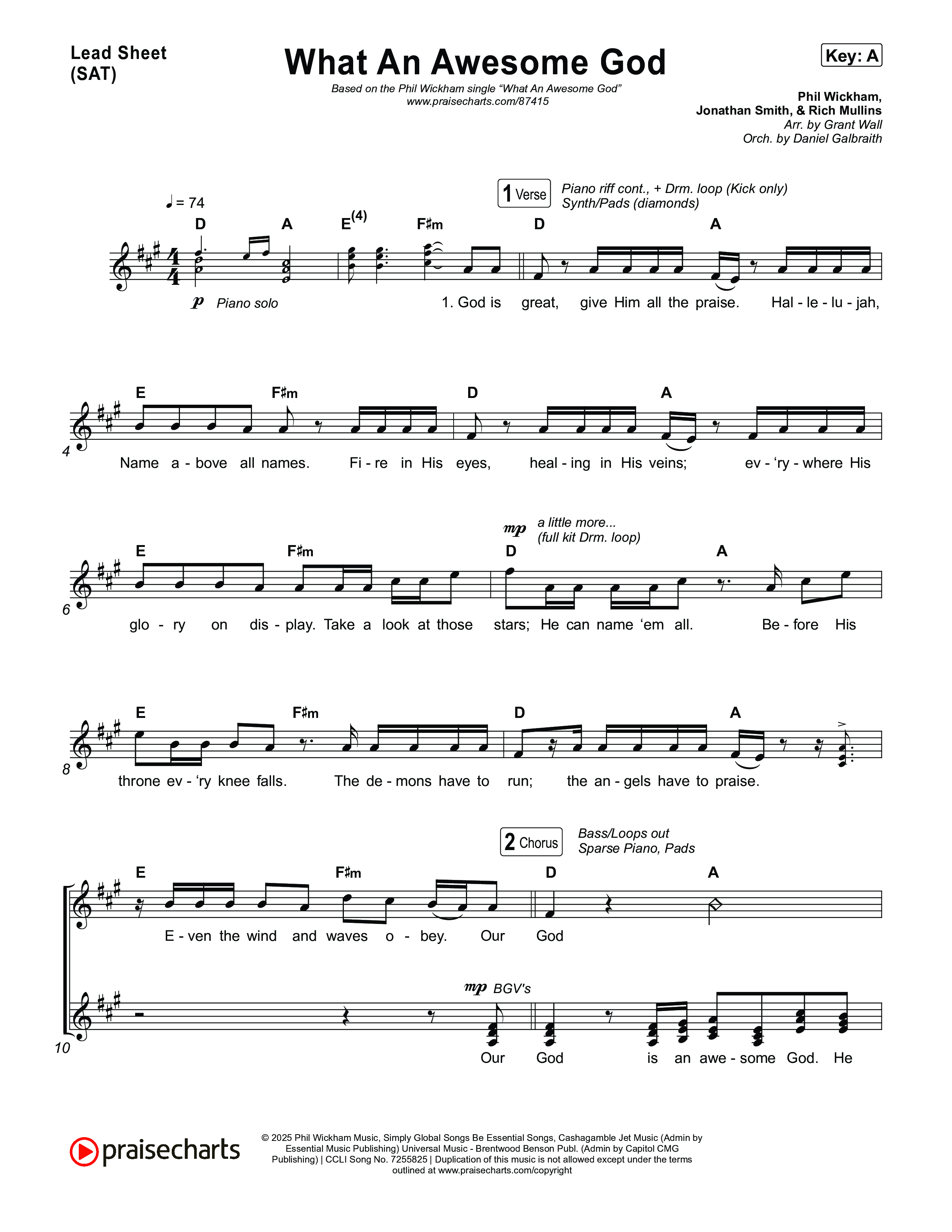Download the sheet music for What An Awesome God by Phil Wickham, from the album Song Of The Saints. This song was arranged by Grant Wall / Daniel Galbraith in the key of A, Ab, D, E, Eb, F, G.