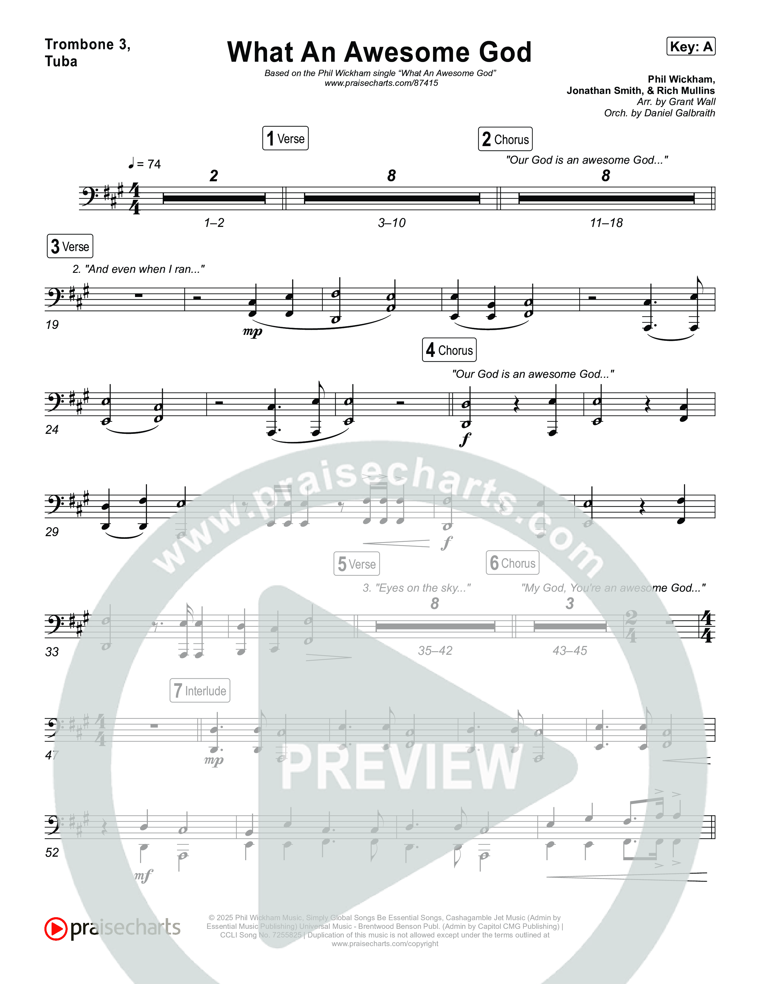 Download the Trombone 3/Tuba sheet music for What An Awesome God by Phil Wickham, from the album Song Of The Saints. This song was arranged by Grant Wall / Daniel Galbraith in the key of A, Ab, D, E, Eb, F, G.