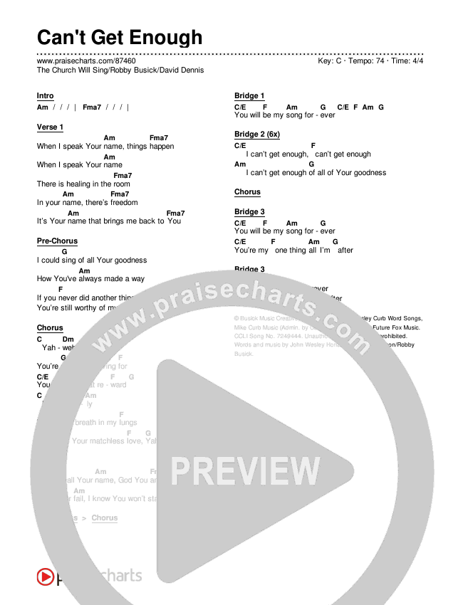 Download the PDF Chord Charts for Can't Get Enough by The Church Will Sing / Robby Busick / David Dennis, from the album Can’t Get Enough.