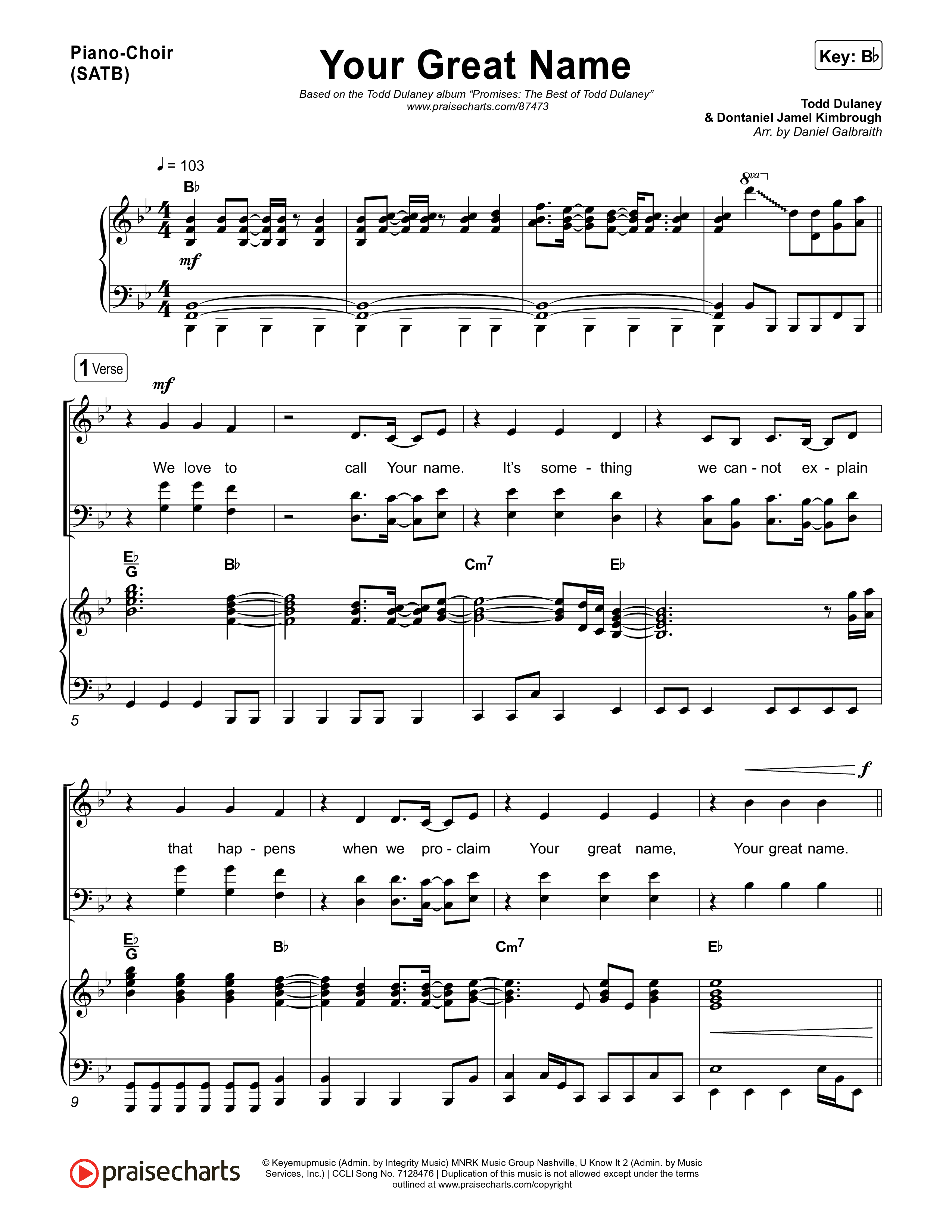Download the PDF sheet music for Your Great Name by Todd Dulaney, from the album Promises: The Best Of Todd Dulaney. This song was arranged by Daniel Galbraith in the key of A, Bb.