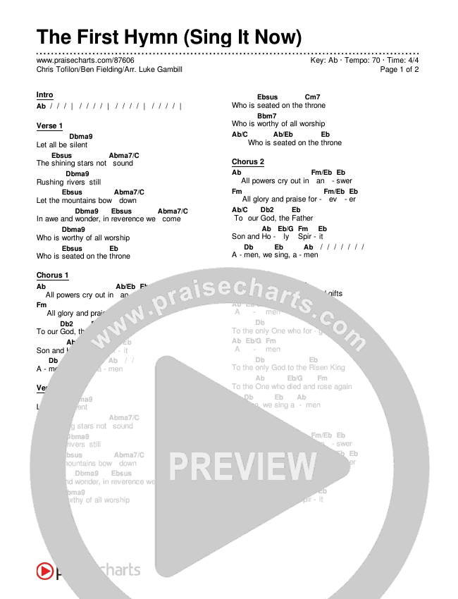 Download the PDF Chord Charts for The First Hymn (Sing It Now) by Chris Tofilon / Ben Fielding / Arr. Luke Gambill, from the album The First Hymn. This song was arranged by Luke Gambill / Daniel Galbraith in the key of Ab.