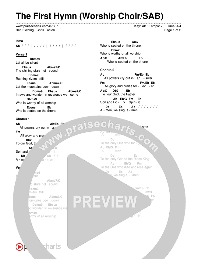Download the PDF Chord Charts for The First Hymn (Worship Choir/SAB) by Chris Tofilon / Ben Fielding / Arr. Luke Gambill, from the album The First Hymn. This song was arranged by Luke Gambill / Daniel Galbraith in the key of Ab.