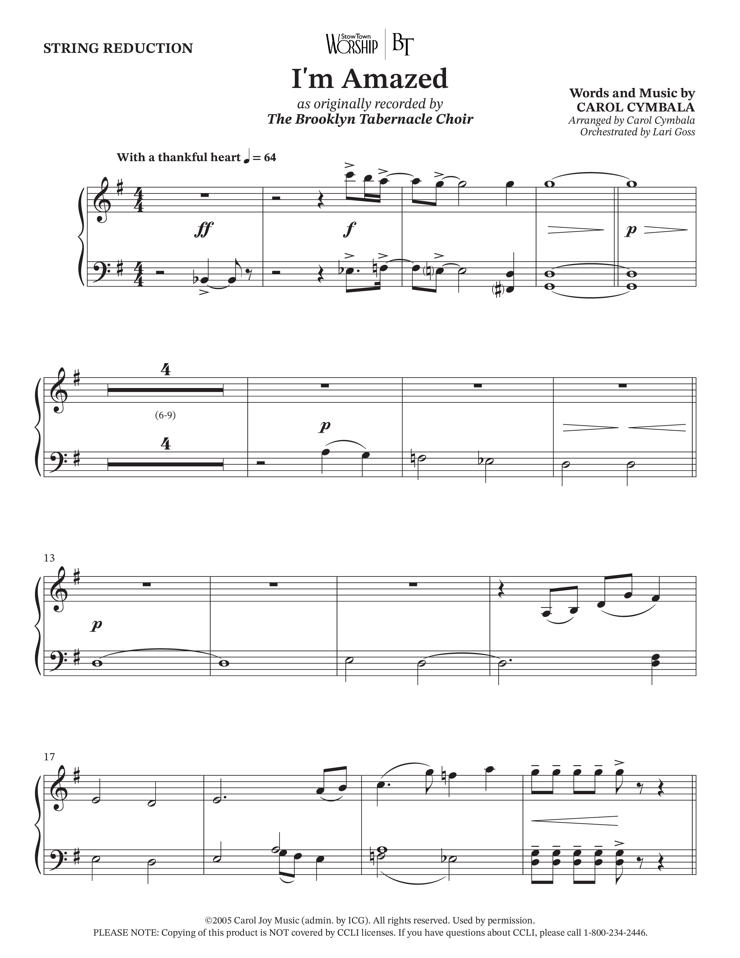 Download the String Reduction sheet music for I'm Amazed (Choral Anthem SATB) by The Brooklyn Tabernacle Choir / Jason Crabb / Arr. Carol Cymbala / Orch. Lari Goss, from the album I'm Amazed. This song was arranged by Carol Cymbala / Lari Goss in the key of G.