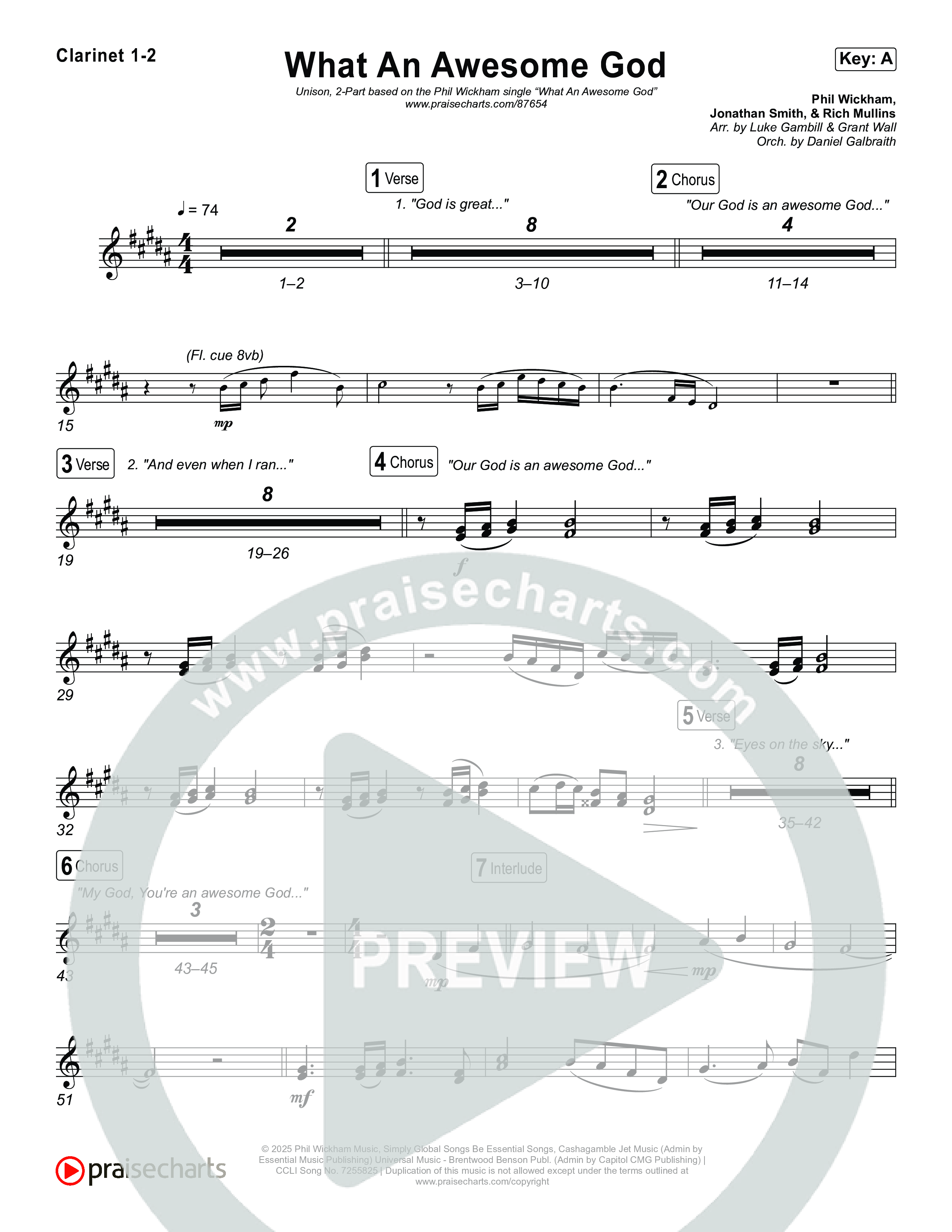 Download the Clarinet sheet music for What An Awesome God (Unison/2-Part) by Phil Wickham / Arr. Luke Gambill, from the album What An Awesome God. This song was arranged by Luke Gambill / Daniel Galbraith / Grant Wall in the key of A.