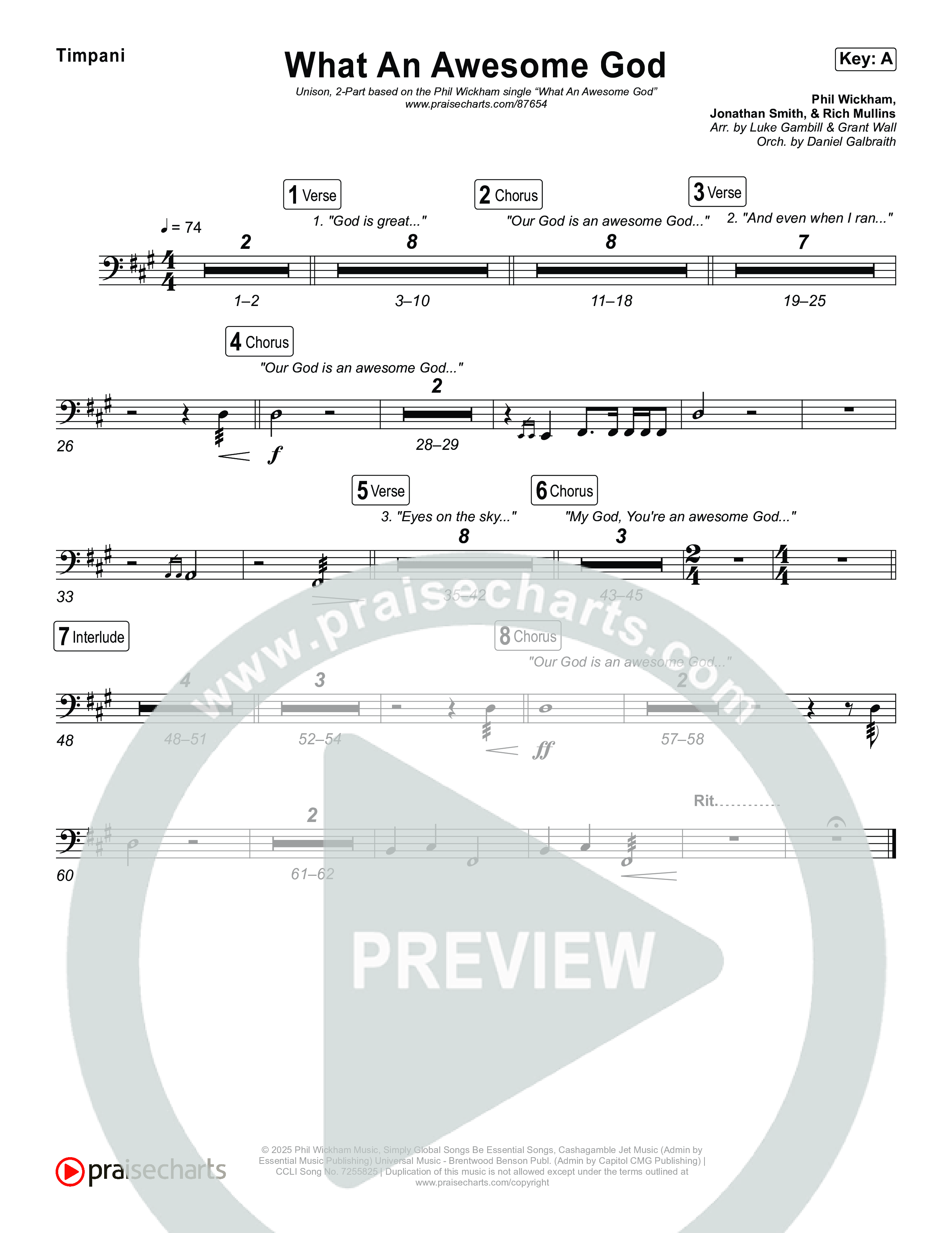 Download the Timpani sheet music for What An Awesome God (Unison/2-Part) by Phil Wickham / Arr. Luke Gambill, from the album What An Awesome God. This song was arranged by Luke Gambill / Daniel Galbraith / Grant Wall in the key of A.