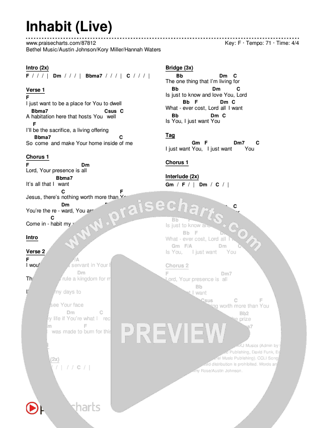 Inhabit (Live) Chords PDF (Bethel Music / Austin Johnson / Kory Miller / Hannah Waters)