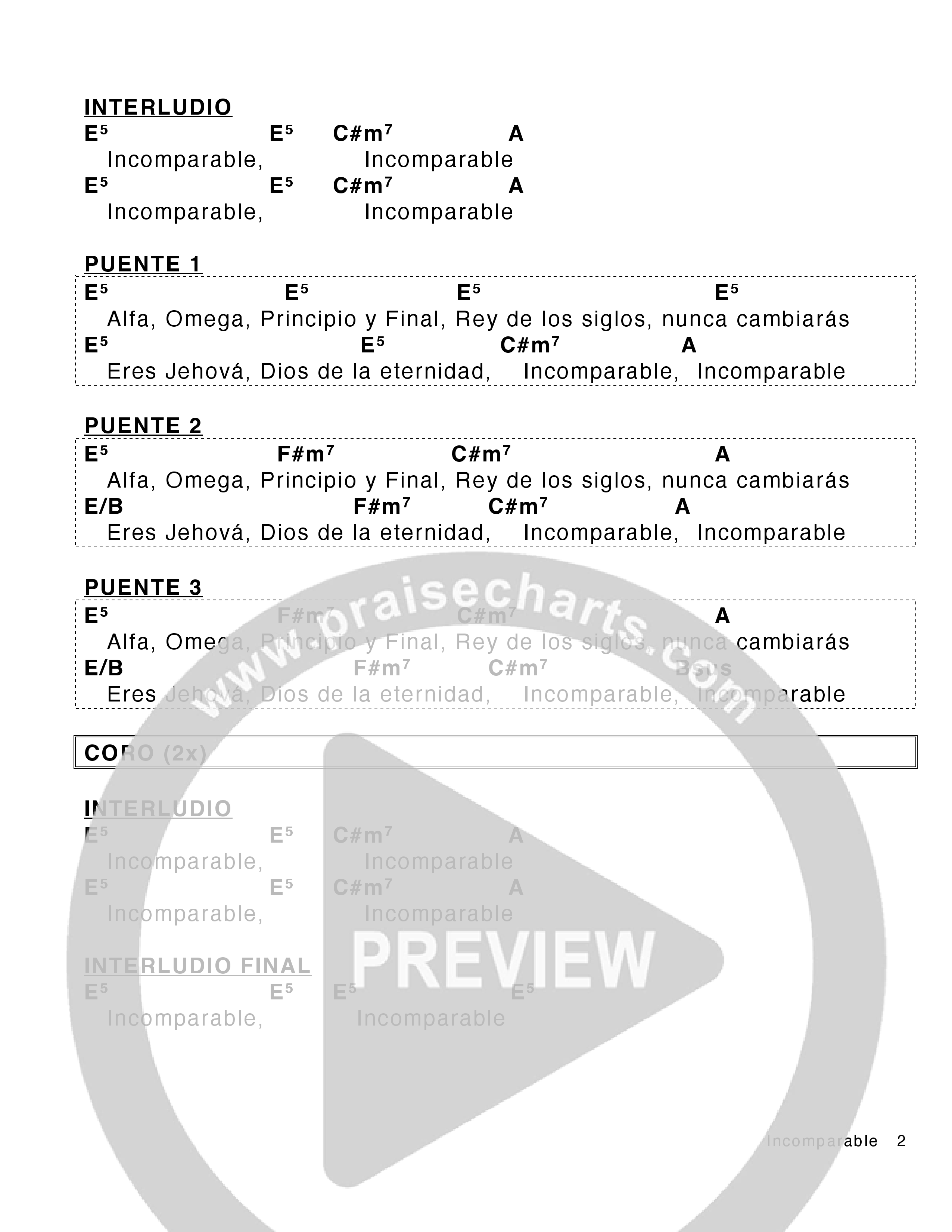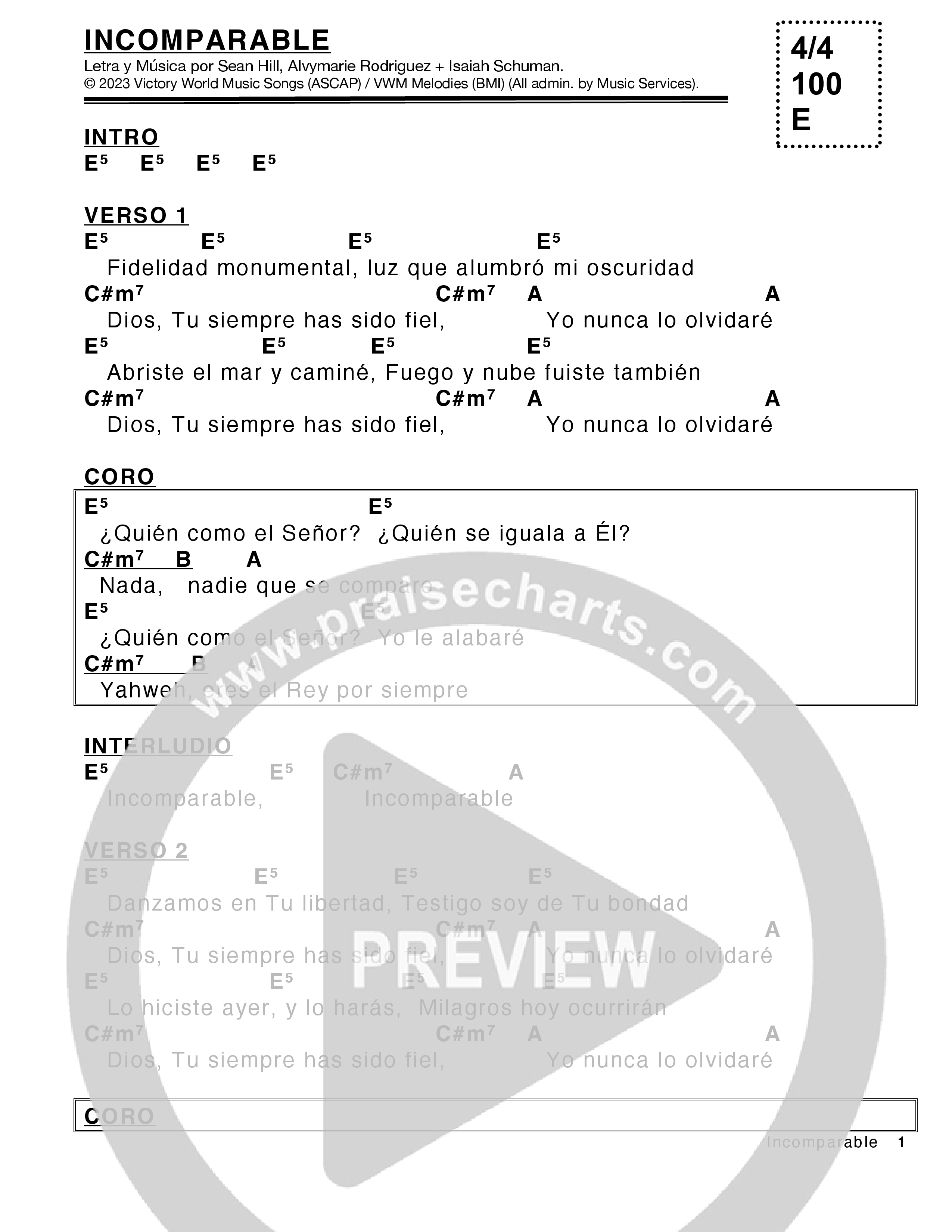 Download the PDF Chord Charts for Incomparable (No Name Like It) by Victory House Worship, from the album Todo Lo Entrego.