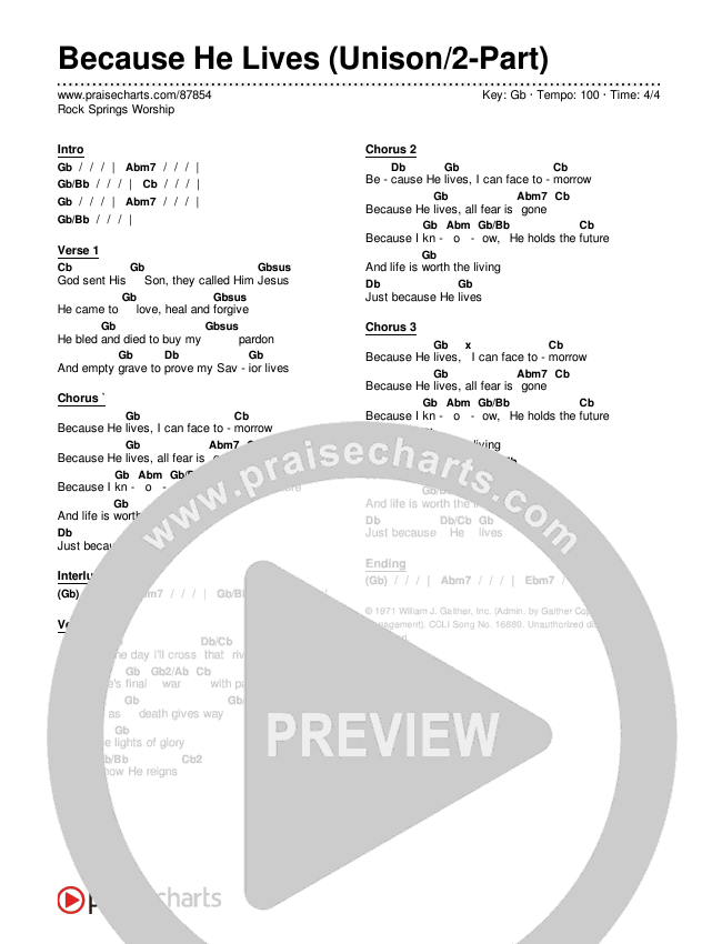 Download the PDF Chord Charts for Because He Lives (Unison/2-Part) by Rock Springs Worship / Arr. Luke Gambill, from the album Hymns Vol 1. This song was arranged by Luke Gambill / Daniel Galbraith in the key of Gb.
