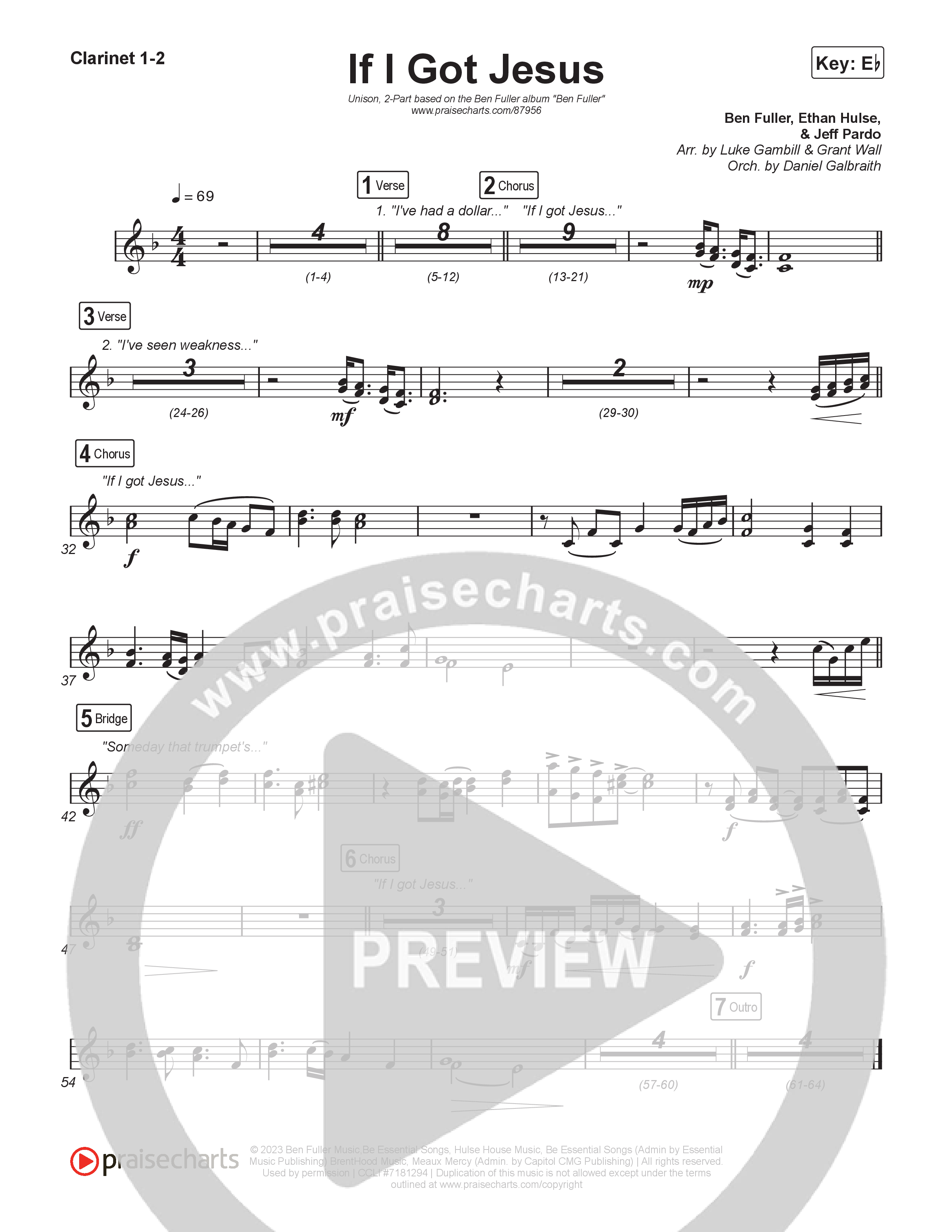 Download the Clarinet sheet music for If I Got Jesus (Unison/2-Part) by Ben Fuller / Arr. Luke Gambill, from the album Ben Fuller. This song was arranged by Luke Gambill / Daniel Galbraith / Grant Wall in the key of Eb.