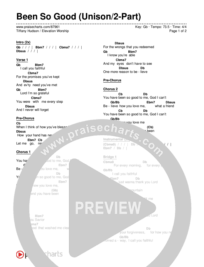 Download the PDF Chord Charts for Been So Good (Unison/2-Part) by Elevation Worship / Tiffany Hudson / Arr. Luke Gambill, from the album Can You Imagine?. This song was arranged by Luke Gambill / Grant Wall / Daniel Galbraith in the key of Gb.