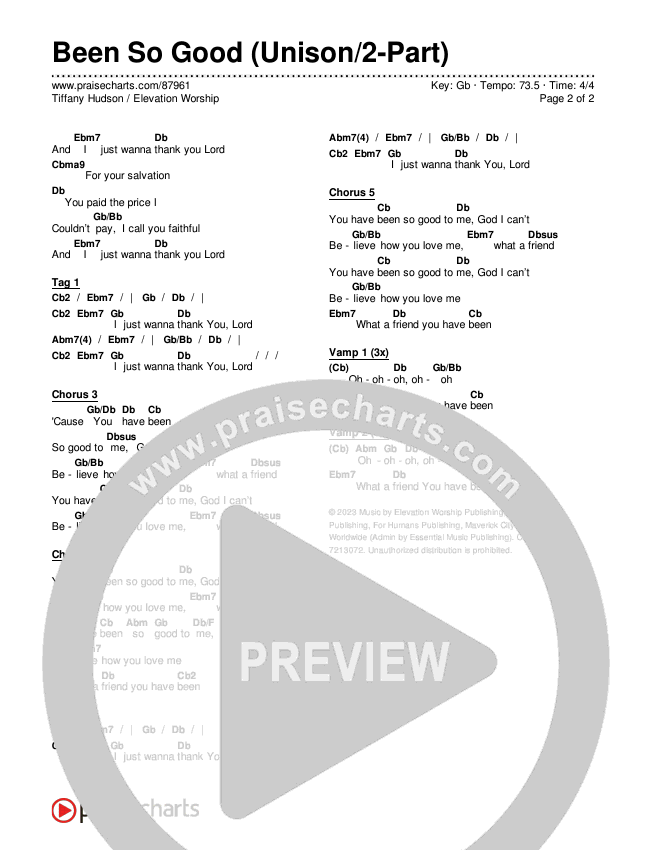 Been So Good (Unison/2-Part) Chords PDF (Elevation Worship / Tiffany Hudson / Arr. Luke Gambill)