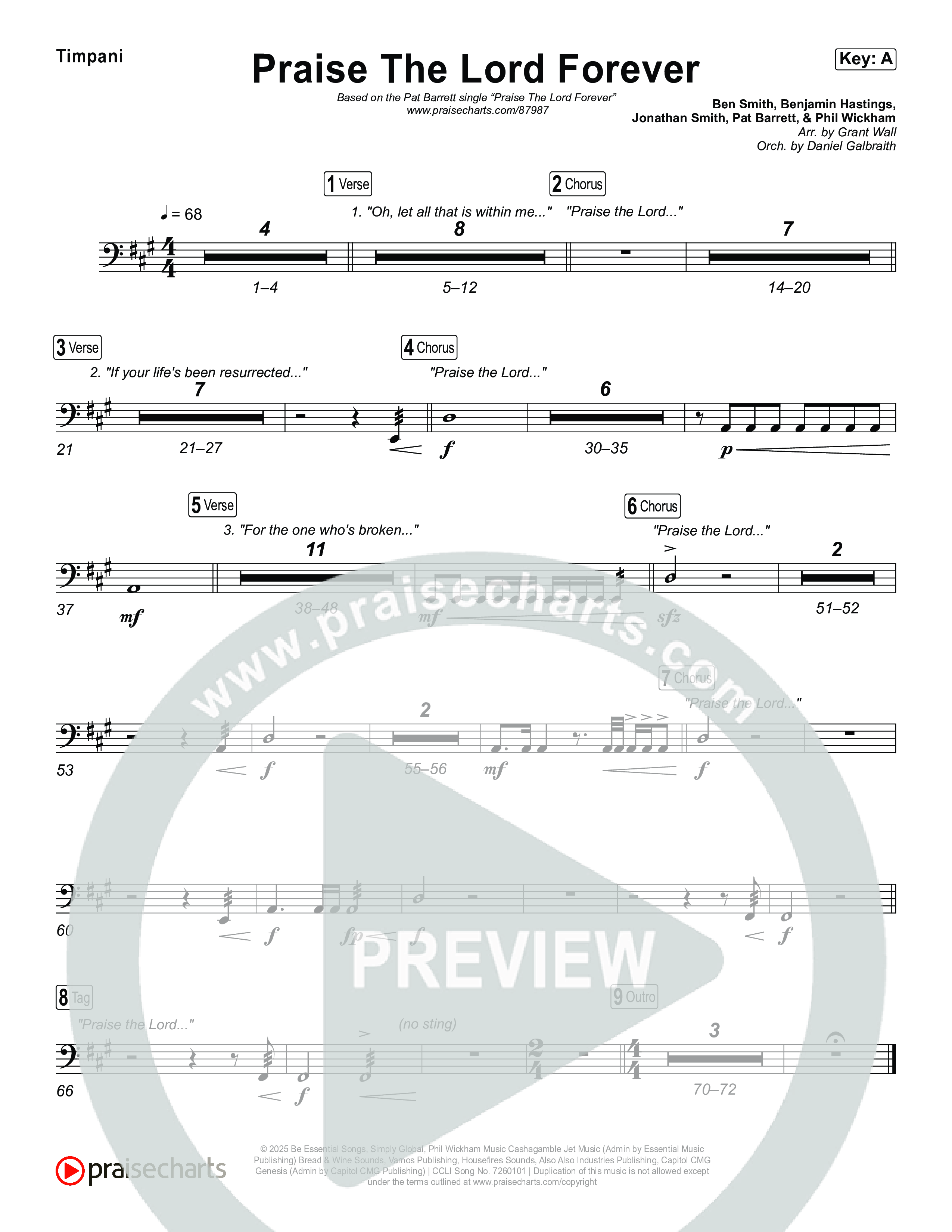 Download the Timpani sheet music for Praise The Lord Forever by Pat Barrett, from the album Praise The Lord Forever. This song was arranged by Grant Wall / Daniel Galbraith in the key of A, G.