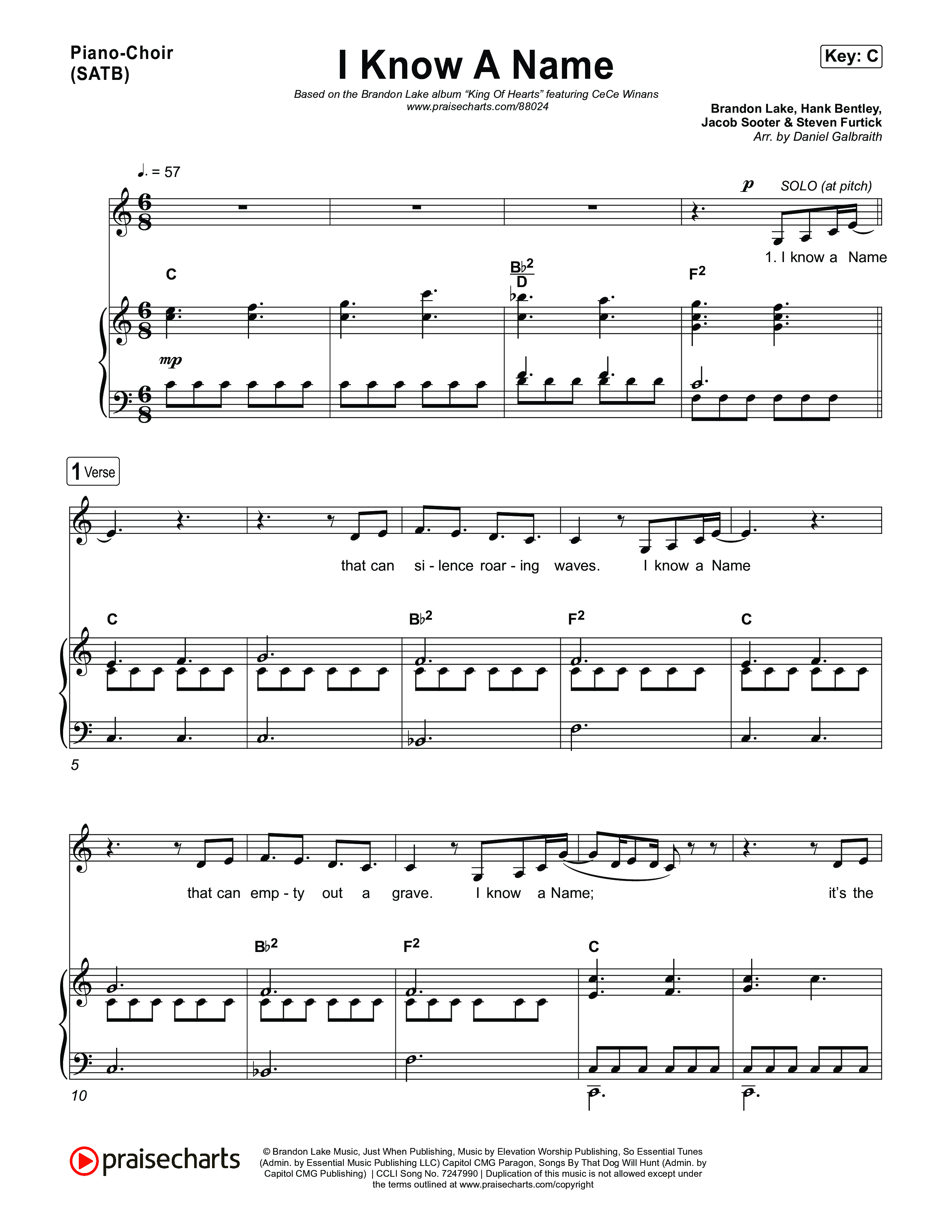Download the PDF sheet music for I Know A Name by Brandon Lake / CeCe Winans, from the album King Of Hearts. This song was arranged by Daniel Galbraith in the key of Bb, C.
