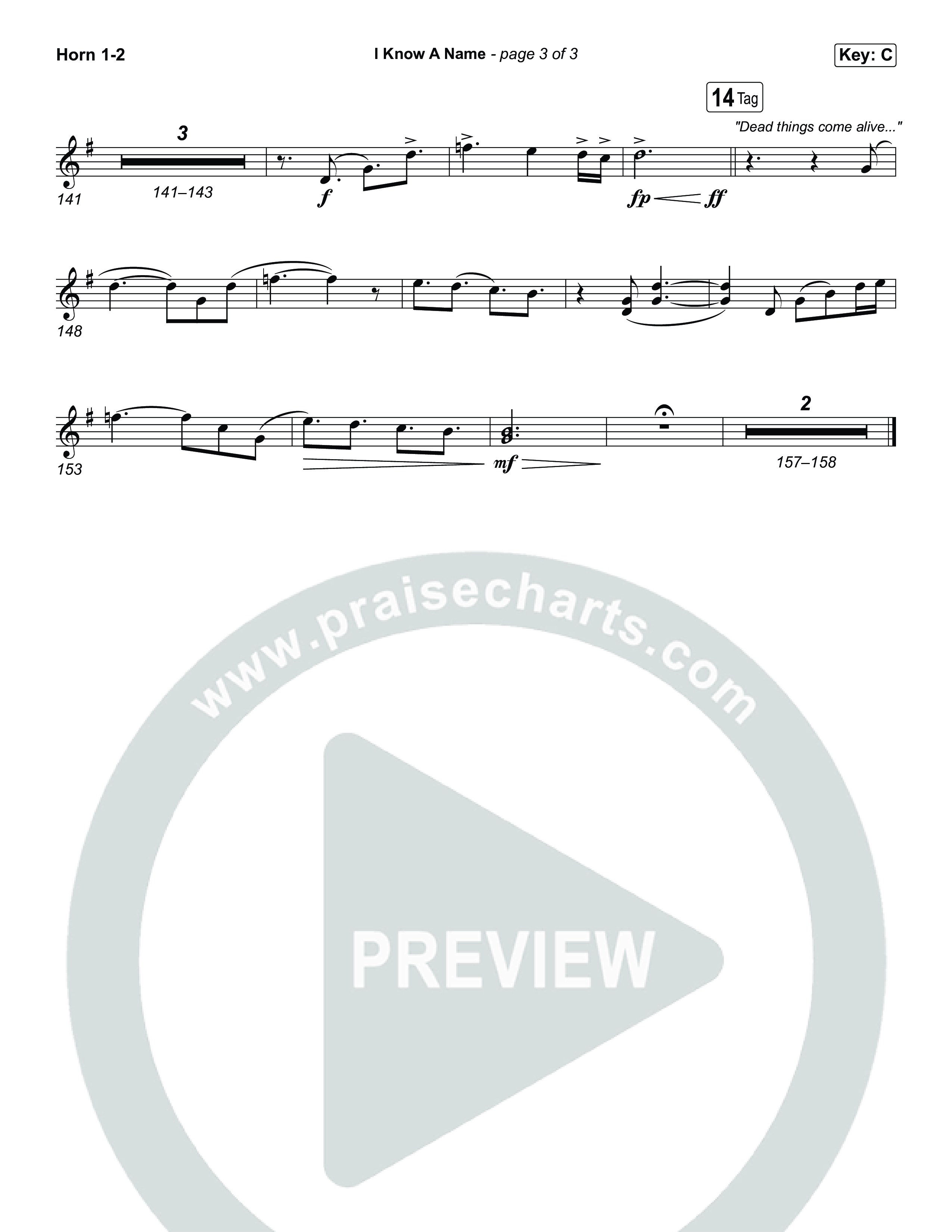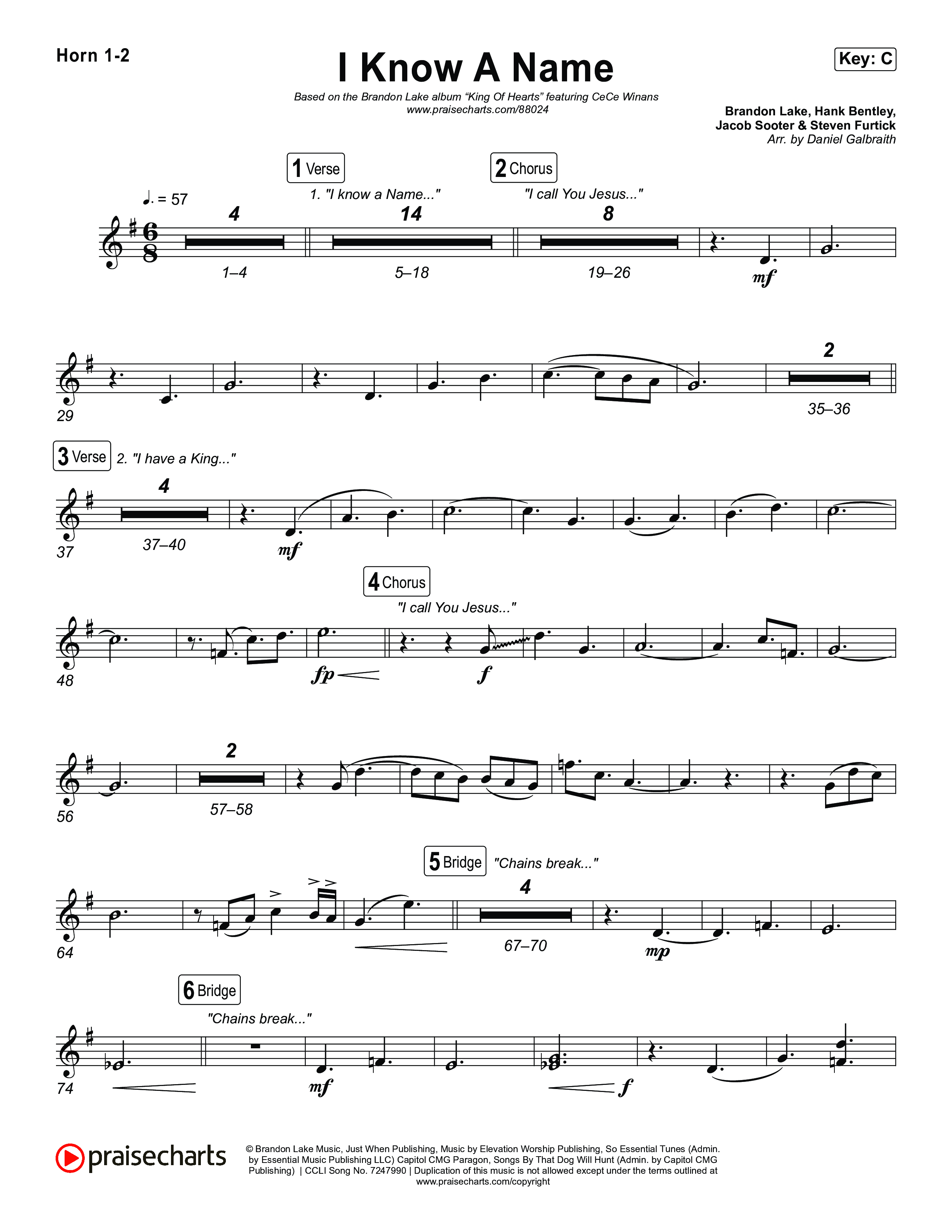 Download the Orchestration brass parts for I Know A Name by Brandon Lake / CeCe Winans, from the album King Of Hearts. This song was arranged by Daniel Galbraith in the key of Bb, C.