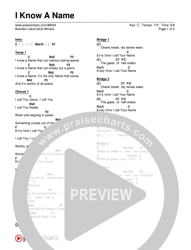 Download the PDF Chord Charts for I Know A Name by Brandon Lake / CeCe Winans, from the album King Of Hearts. This song was arranged by Daniel Galbraith in the key of Bb, C.