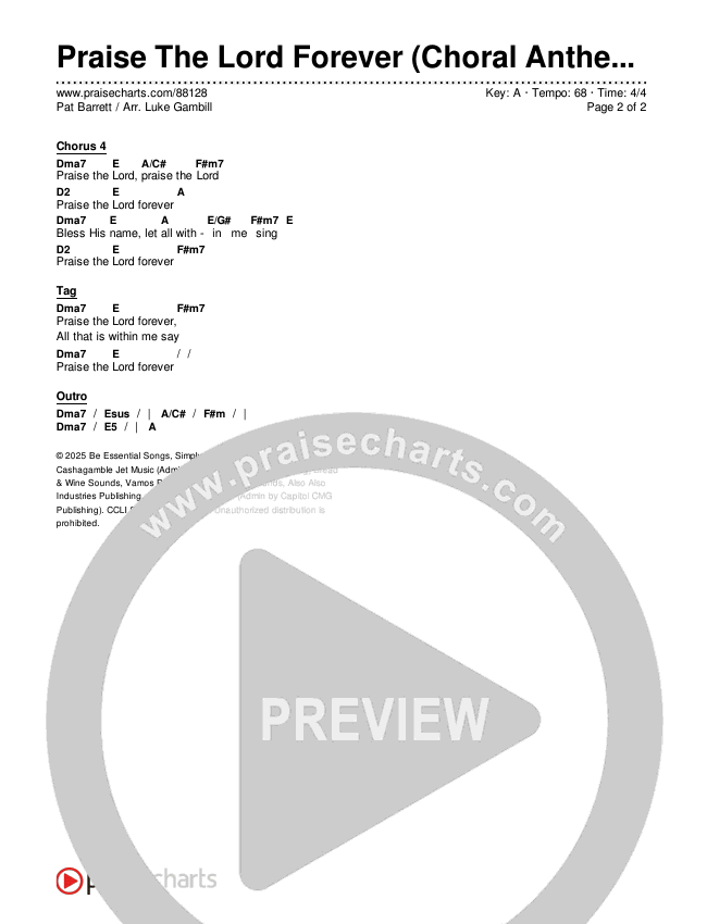 Download the PDF Chord Charts for Praise The Lord Forever (Choral Anthem SATB) by Pat Barrett / Arr. Luke Gambill, from the album Praise The Lord Forever. This song was arranged by Luke Gambill / Grant Wall / Daniel Galbraith in the key of A.