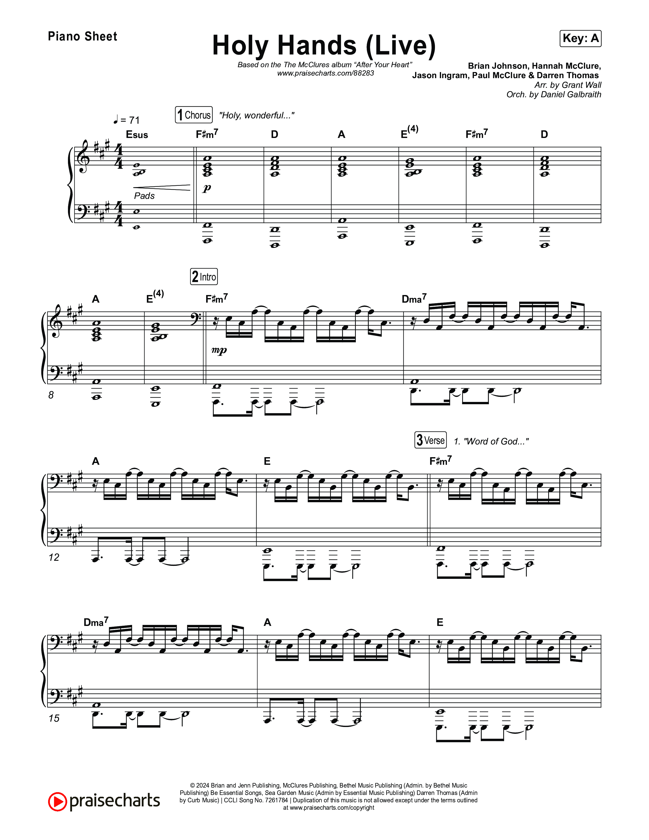 Download the piano sheet for Holy Hands (Live) by The McClures, from the album After Your Heart (Live). This song was arranged by Grant Wall / Daniel Galbraith in the key of A, Bb.